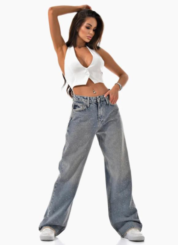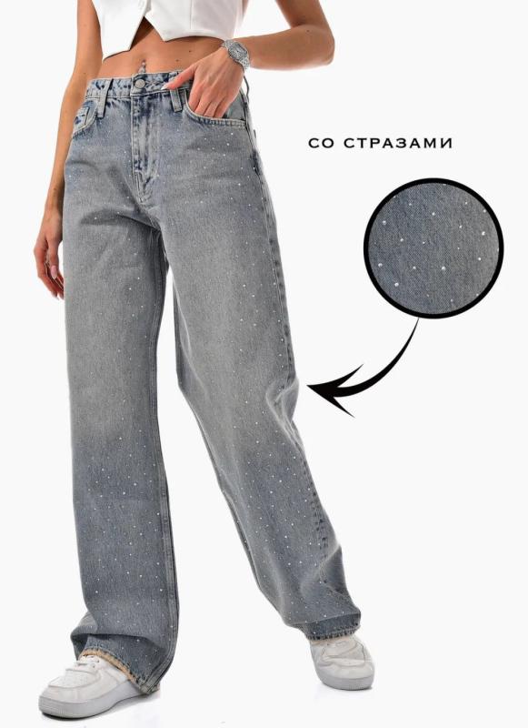 Прямой крой багги с высокой посадкой визуально вытягивает силуэт, а стразы по всей длине добавляют яркости.