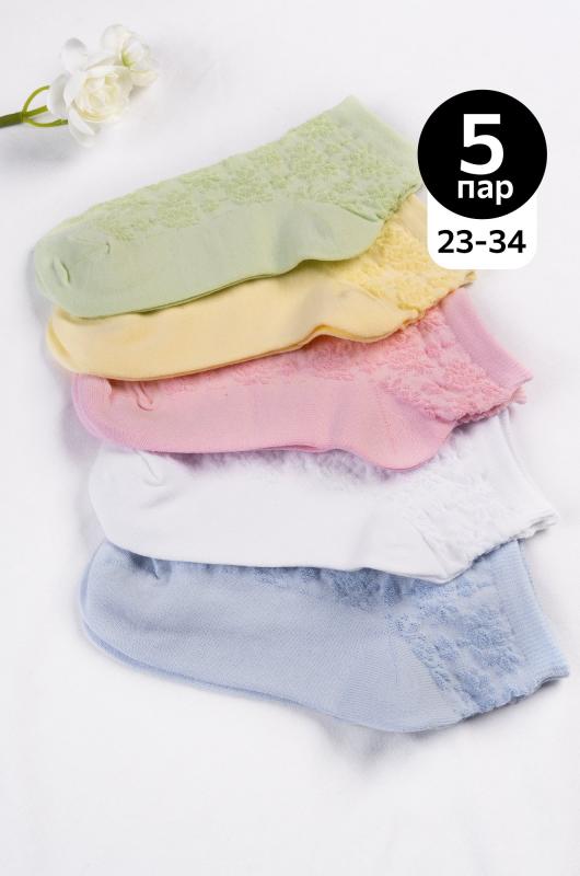 Красивые носочки – для вашей дочки! Стильный набор детских носков из 5 пар представлен в пастельных цветах. Ажурные носки для девочки выполнены с высоким содержанием хлопка. Фактурный кружевной узор добавляет в образ нотки изящества и кокетства.