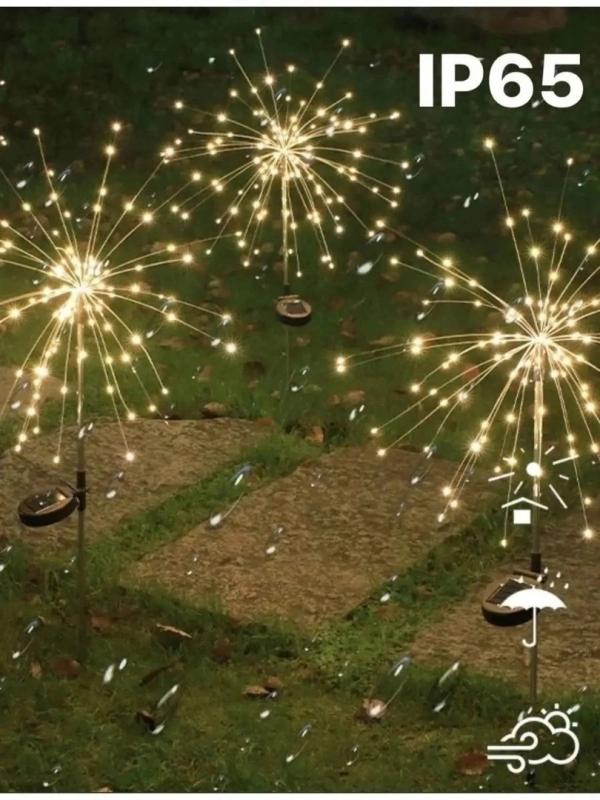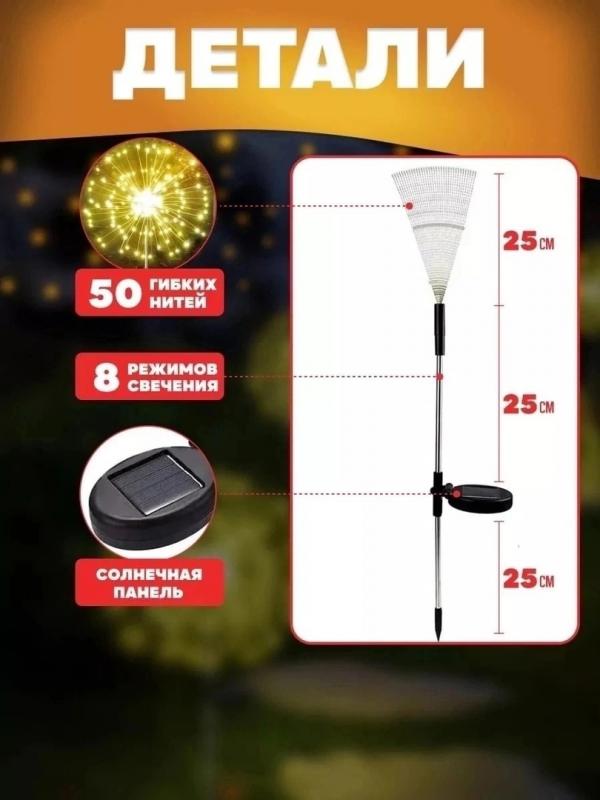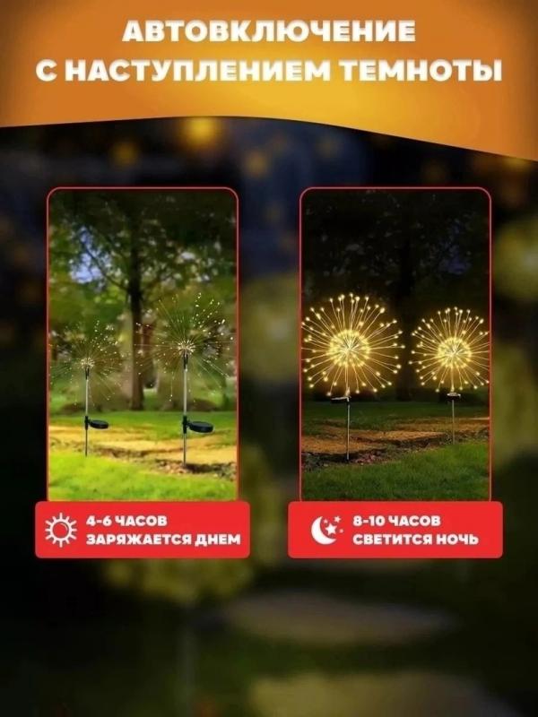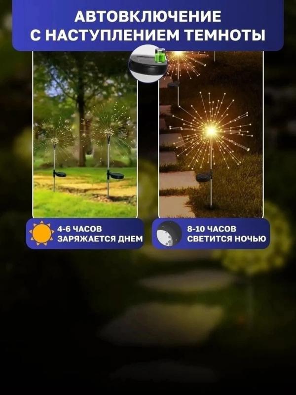 Самый идеальный уличный светильник Фейерверк с теплым свечением на солнечной батарее для Вашего сада. ВАЖНО! Каждый светильник проверен нами вручную на брак и комплектность, тщательно упакован от повреждений! В случае возникновения вопросов или проблем с качеством фонаря/упаковки убедительно просим Вас связаться с нашей службой технической поддержки или написать нам в раздел ВОПРОСЫ, мы оперативно Вам поможем. Светильник поставляется в разряженном выключенном виде. Перед использованием необходимо включить светильник и зарядить от яркого солнечного света не менее 5 часов! Лучшее решение это садовый светильник медуза светодиодный, который функционирует на солнечной батарее - аккумулятор сам заряжается в дневное время от солнечной энергии. Высокая степень защиты IP65 от влаги позволяет оставлять светильник в саду даже во время дождя. Садовый фонарь оснащен датчиком света - он автоматически включается в темное время и выключается при восходе солнца. Время работы фонариков на батарейка