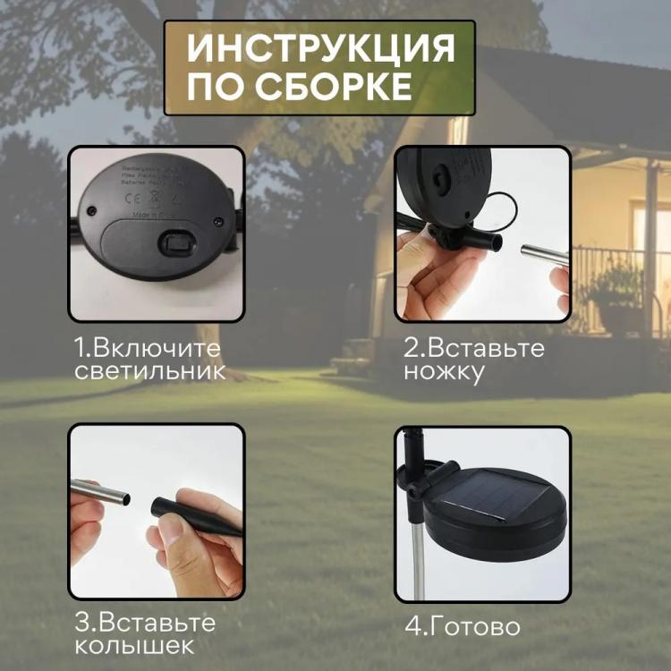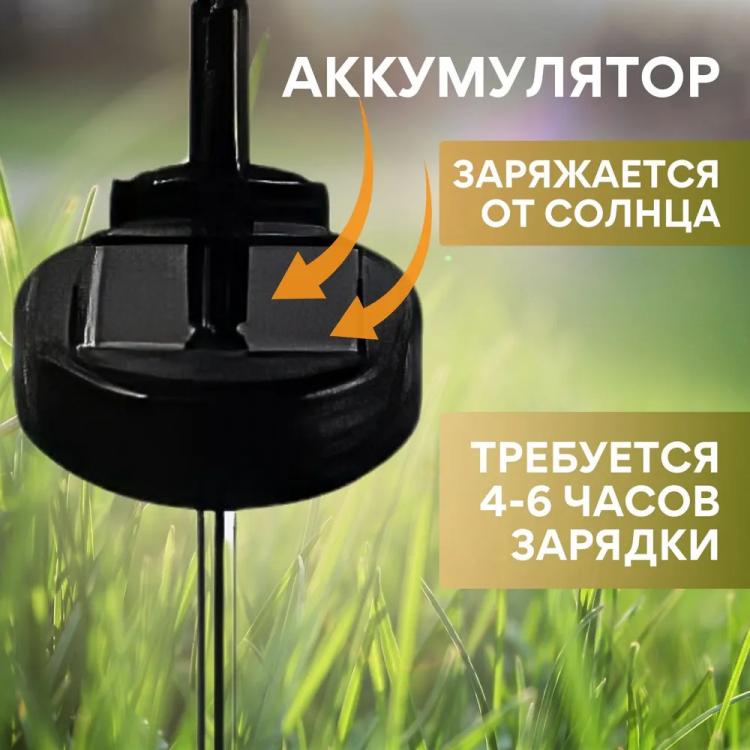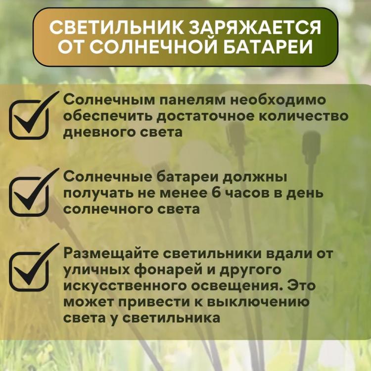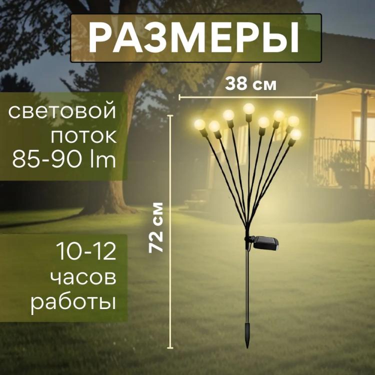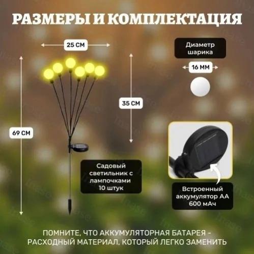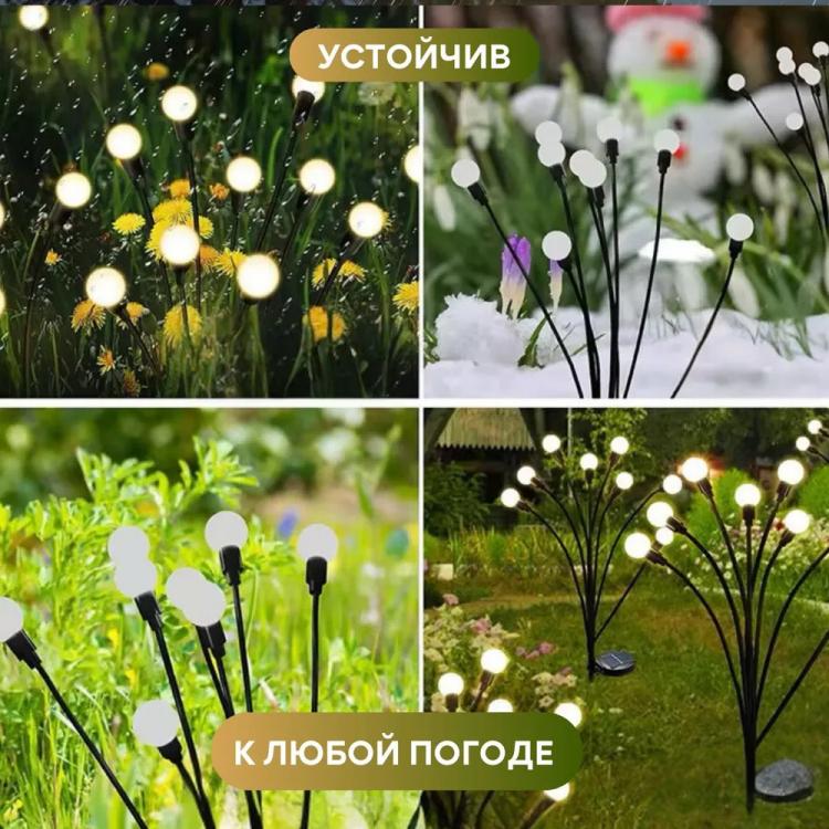 В упаковке 2 светильника. Светильник садовый светлячок выполнен в виде букета из десяти небольших шариков на гибких стебельках. Дачный светильник имеет 8 светодиодов теплого свечения. Верхняя часть имеет гибкое основание и принимает любую форму. Вы сможете настроить любое понравившееся положение фонариков. Светильники безопасны для использования в помещении, детали не нагреваются при использовании. Легкая сборка, острый прочный колышек позволяет устанавливать светильник в грунт любой твердости. Светильник садовый - необходим для садоводства, светильник уличный на солнечной батарее подходит в освещении садовых дорожек, придомовых территорий, приусадебных участках, декора клумб и альпийских горок, газона, подсветят ваши садовые фигурки, мест отдыха и рыбалки, пруда, туристической палатки для кемпинга, служит как светильник декоративный или точечные светильники. Небольшие размеры позволят Вам расположить светильник на любой приусадебный участок. При желании возможно расположить в кусах и на деревьях. Светлячки