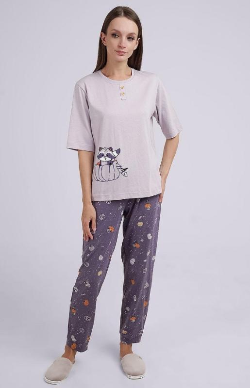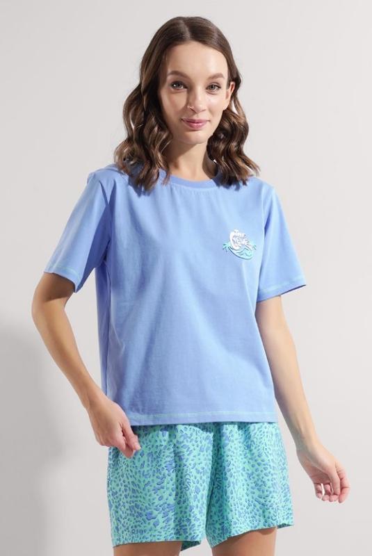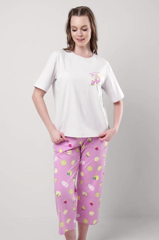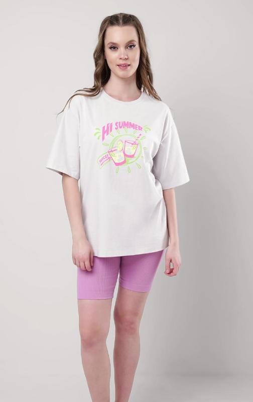 Состав: 95% хлопок, 5% эластан Описание: Пижама для дома.Футболка из трикотажного полотна. Округлая горловина с обтачкой. Втачной короткий рукав. Сзади средний шов.Спереди принт, нашивка.Шорты длинные, облегающие из трикотажного полотна кашкорсе.По талии притачная резинка жаккард, нашивка.