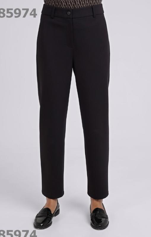 Описание: Брюки зауженные из трикотажного полотна джерси с вискозой. Притачной пояс со шлевками. Гульфик с застежкой на молнию и пуговицу. Боковые карманы с отрезным бочком. На спинке справа имитация кармана листочка. Состав: 65% вискоза, 31% полиэстер, 4% эластан