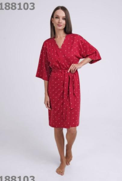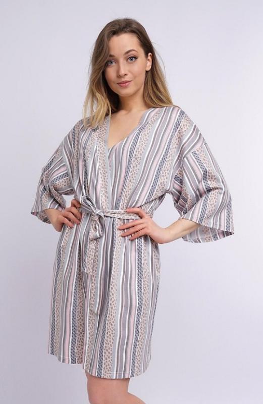 Описание: Халат-кимано из трикотажного полотна. Спущенная линия плеча, короткий рукав. По талии съёмный пояс, вставлен в шлёвки по бокам. Состав: 50% хлопок, 50% модал