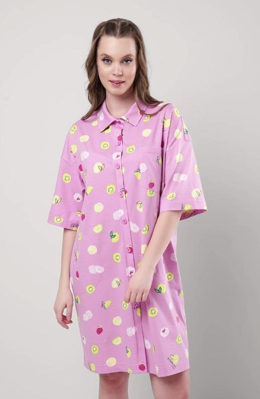 Описание: Халат для дома свободного прямого кроя из хлопкового трикотажного полотна, с застежкой на пуговицы. Короткий рукав со спущенной линией плеча.По горловине отложной воротник,по борту цельновыкроенная планка.Спереди накладной карман, в боковых швах карманы. Состав: 100% хлопок