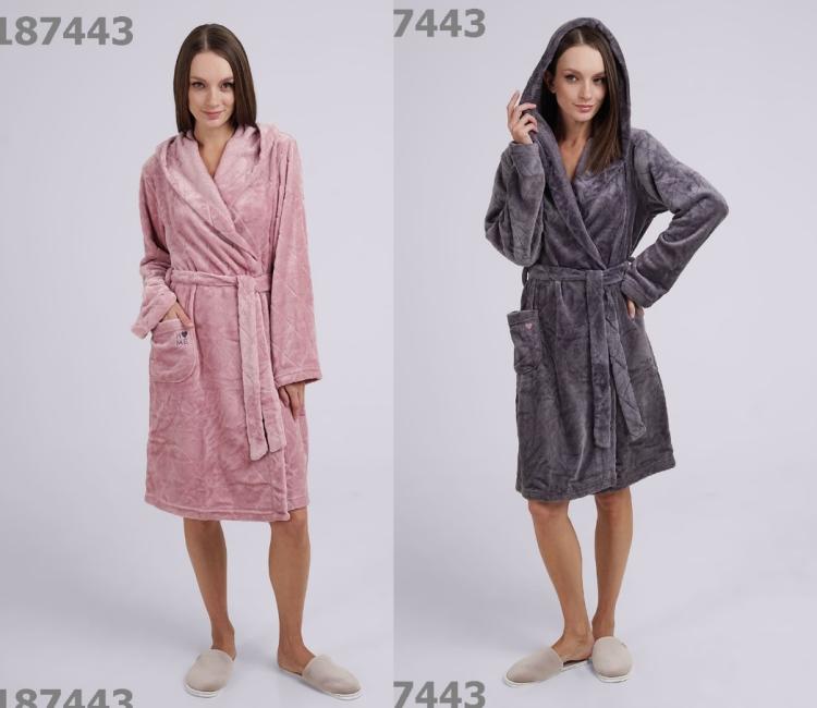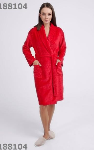 Описание: Женский халат из фактурного велсофта на запах с поясом и капюшоном, рукав полной длины, на переде накладной карман с вышивкой. Состав: 100% полиэстер