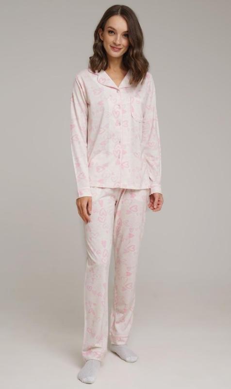 Женский домашний комплект из рубашки и брюк. Костюм выполнен из прочного, износостойкого хлопкового полотна с лиоцелем, который производится из волокон эвкалипта. Поэтому мягкая ткань с легким блеском приятна на ощупь, не вызывает раздражения и прекрасно дышит. Комплект для дома комфортно сидит на любой фигуре, не теряет форму и яркость даже после множества стирок, практически не мнется. Рубашка с отложным воротничком и застежкой на пуговицы дополнена нагрудным карманом. По рукавам манжеты. Прямые брюки в набивку сердечки на поясе с внутренней резинкой и удобными карманами. Состав: 50% хлопок, 50% лиоцель