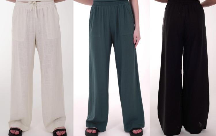 Описание: Брюки широкие из текстильного полотна лен с вискозой. По талии притачной пояс на резинке с внутренними завязками. Боковые накладные карманы. Состав: 80% вискоза, 20% лён