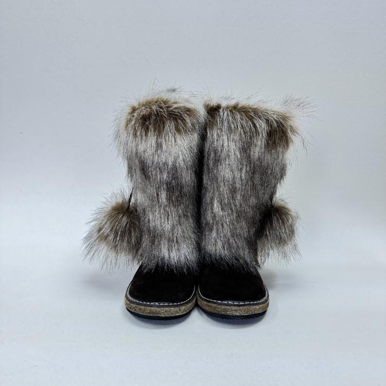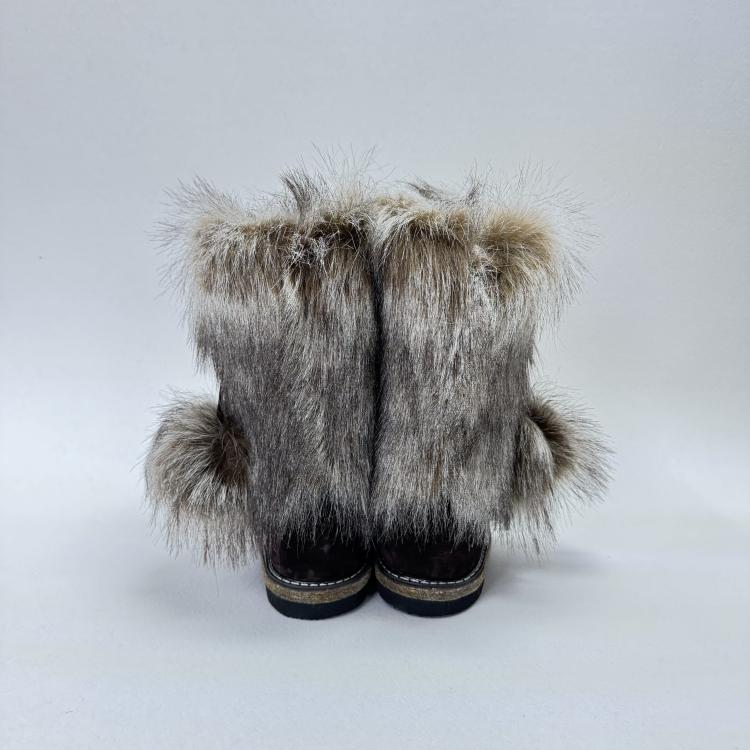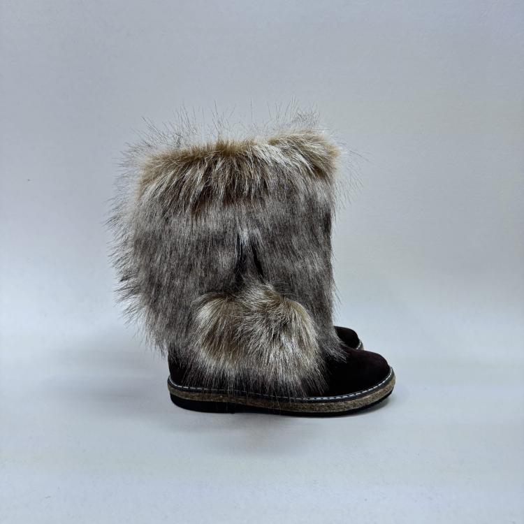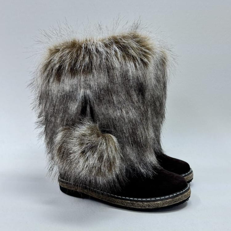 Теплые женские унты в шоколадном цвете. Материал верха — мех “лиса”, натуральная шоколадная замша, стелька из теплой шерсти. Детали: наружная сторона голенища выполнена из искусственного меха, внутри натуральная овчина(между ними утеплитель), ТЭП подошва, логотип бренда, союзка-натуральная замша.