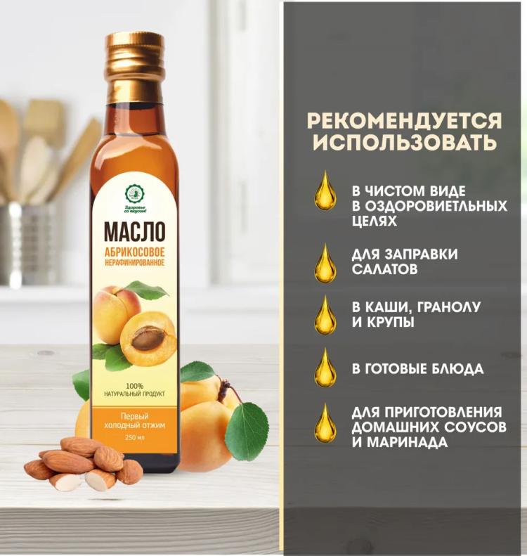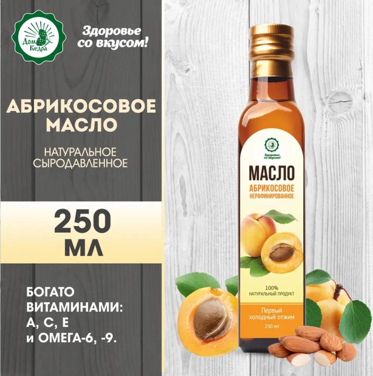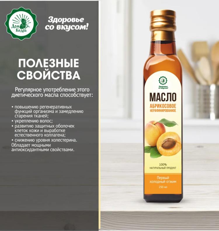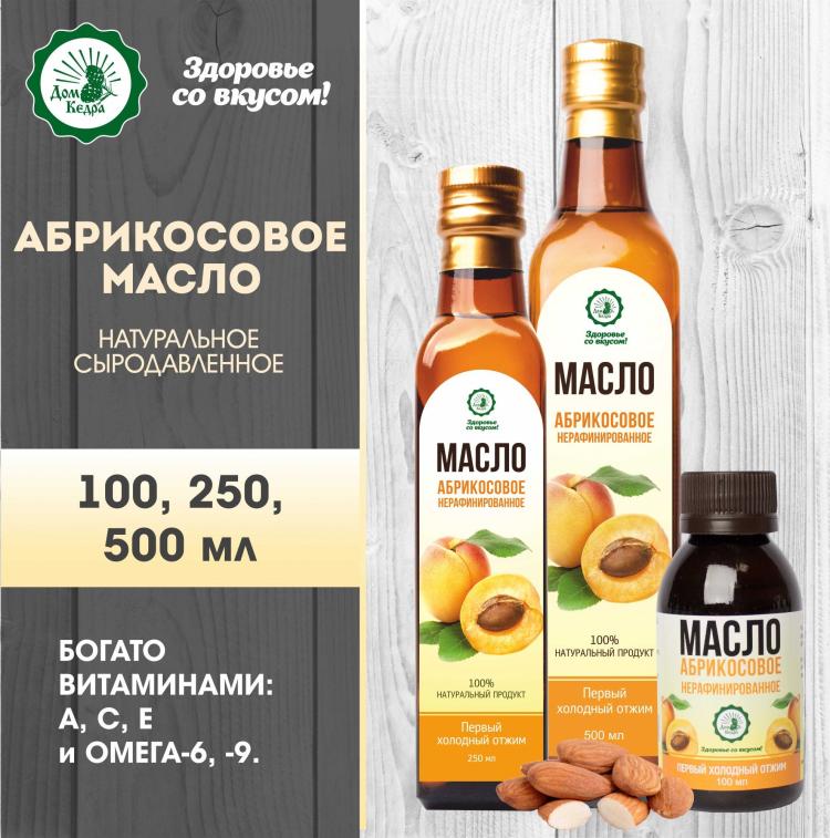 Деликатесное масло с тонким ароматом абрикосовой косточки. Появившись в широкой продаже сравнительно недавно, абрикосовое масло стало пользоваться постоянным спросом. Это нежное масло прекрасно подойдет для заправки диетических блюд, каш, приготовления десертов и кондитерских изделий. Абрикосовое масло содержит несколько витаминов, являющихся мощными антиоксидантами: токоферол (E), предохраняющий клетки от внешнего влияния, улучшающий кислородное питание, укрепляющий волосы
