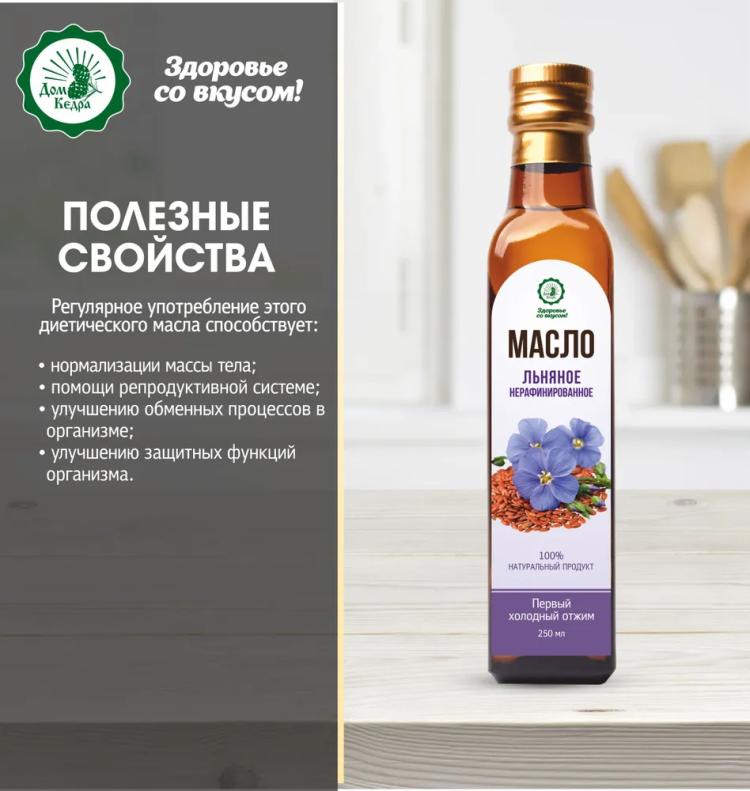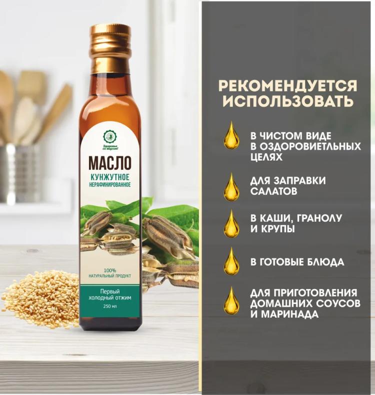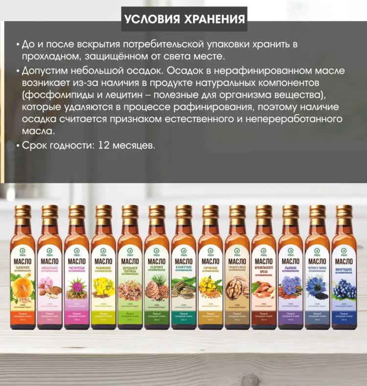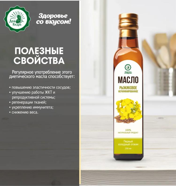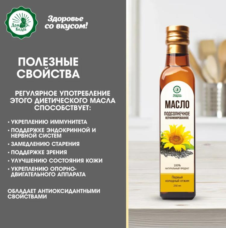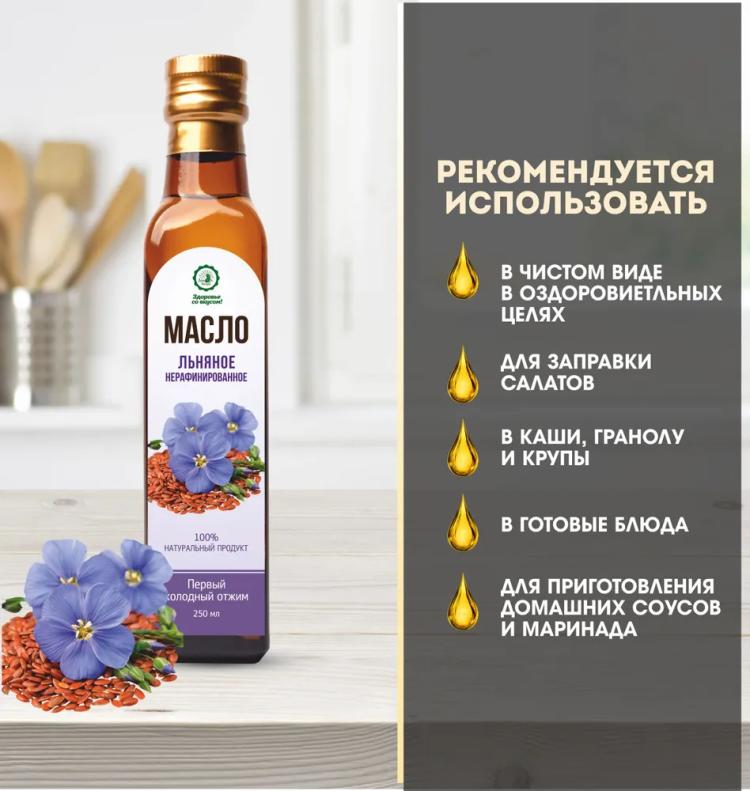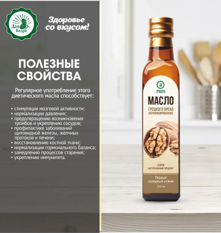 стимуляции работы мозга. Масло придаёт неповторимый вкус холодным и горячим блюдам. Рекомендуется для заправки салатов, гарниров и супов