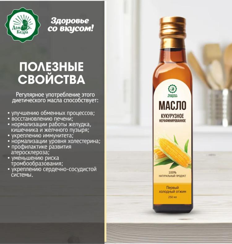 Кукурузное масло – превосходный диетический продукт. Оно оказывает позитивное воздействие на множественные системы организма. Регулярное употребление этого масла дает возможность наладить обменные процессы. Этот продукт способствует улучшению работы кишечника, желчного пузыря и печени, оно является довольно эффективным желчегонным средством. Также можно отметить защитное действие этот продукта на генетический аппарат всех клеток: предотвращение ионизирующих излучений и мутаций, являющихся следствием действия химических веществ на организм. Ненасыщенные жирные кислоты масла кукурузы способствуют повышению сопротивляемости к атакам инфекционных вирусов. В составе кукурузного масла есть вещества, которые дают возможность понизить уровень холестерина. Так, кукурузное масло помогает предотвратить развитие атеросклероза и уменьшает риск тромбообразования. Этот продукт обладает общеукрепляющим действием. В нем содержится витамин К, который положительно воздействует на работу сердечно-сосудистой системы. Благодаря