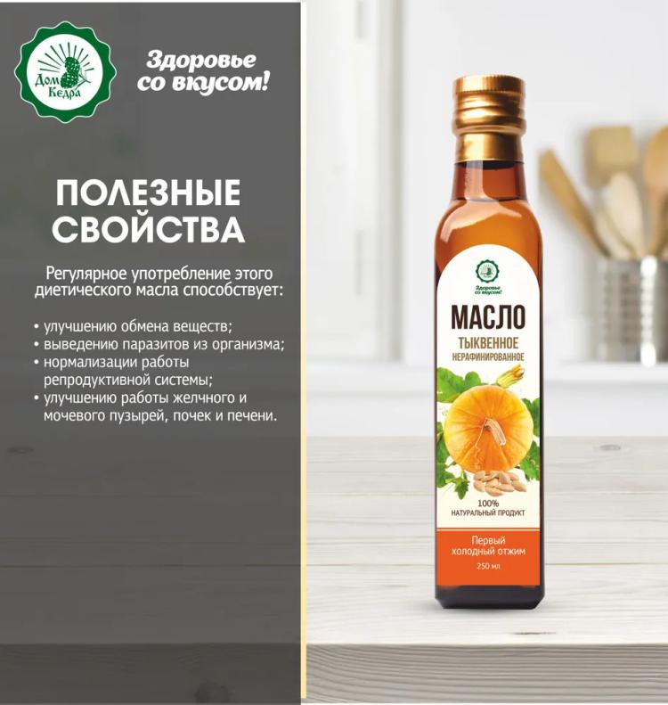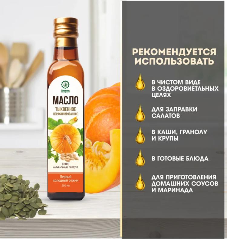 Масло с насыщенным вкусом и ароматом тыквенной семечки рекомендуется к блюдам из круп, бобовых, овощам, салатам и кашам. Тыквенное масло улучшает состояние печени и желчного пузыря, способствует хорошему пищеварению. Регулярное употребление масла укрепляет иммунитет, стимулирует обмен веществ, помогает снизить вес, улучшает состояние кожи и волос. Регулярное употребление масла из семян тыквы укрепляет иммунитет, стимулирует обмен веществ, помогает похудеть, улучшает состояние кожи и волос. Масло тыквы полезно высоким содержанием легкоусвояемых белков, витаминов А, Е, F, С, Р, группы В. Полезные свойства тыквенного масла помогут при заболеваниях сердца, сосудов, печени, желчного и мочевого пузыря, простатите. Полезный и вкусный продукт лечит гастрит, предупреждает развитие хронических воспалений, избавляет от изжоги, поддерживает эластичность кожи и сосудов.