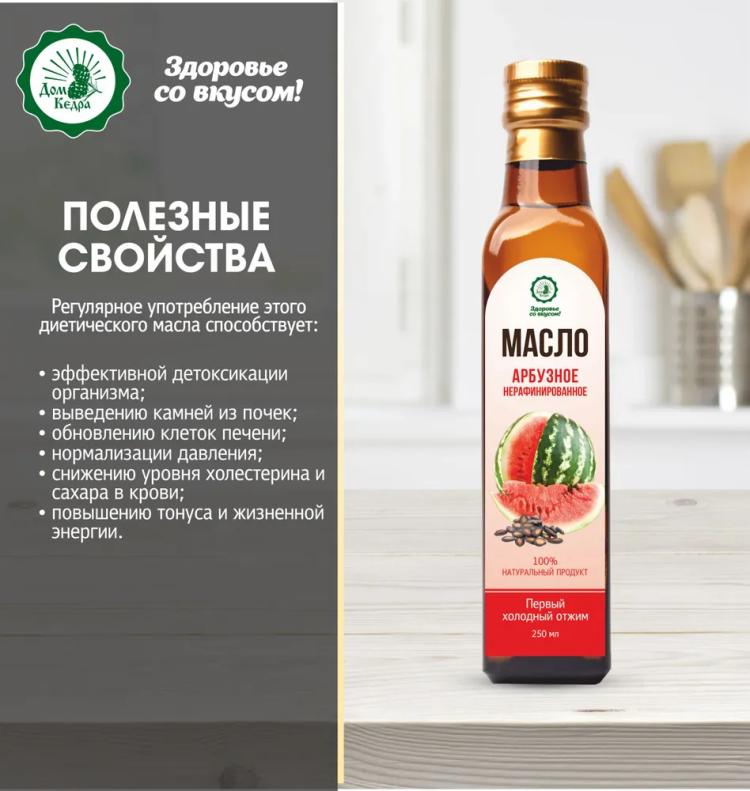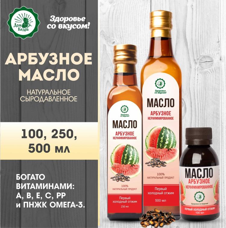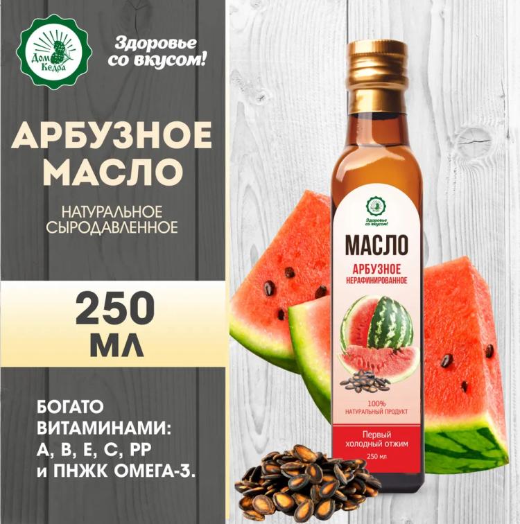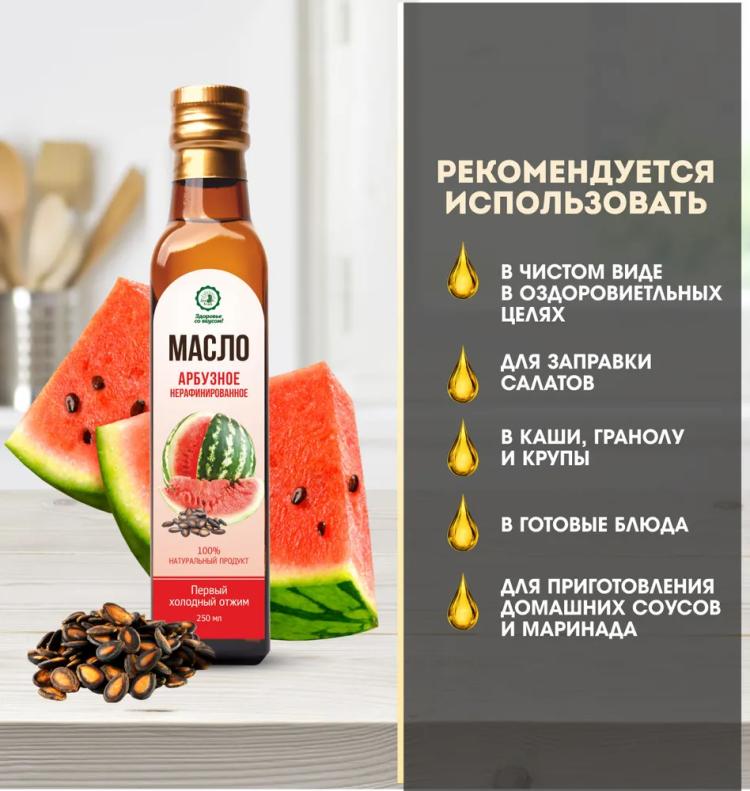 Арбузное масло широко применяется в кулинарии, медицине и косметологии. Оно хорошо выводит токсины и очищает организм, помогает при заболеваниях почек, поддерживает полноценную работу печени. Можно использовать арбузное масло в качестве заправки или составного ингредиента при приготовлении практически любого блюда, будь то лёгкий овощной салат или домашний торт. Арбузное масло используется в косметологии, оно способно улучшить состояние кожи любого типа – быстро впитывается, регулирует уровень увлажнения и жирности кожи, делая её мягкой и бархатистой. Арбузное масло богато полинасыщенными кислотами. Оно почти на 60% состоит из линолевой кислоты. Помимо активного использования в косметологических целях, это вещество используется при профилактике приступов стенокардии и даже рака. Для людей, желающих сбросить вес, ценно наличие пальмитиновой и стеариновой кислот, которые способствуют выведению плохого холестерина. Эти вещества можно встретить также в натуральном горьком шоколаде. Витамины группы В жизненн