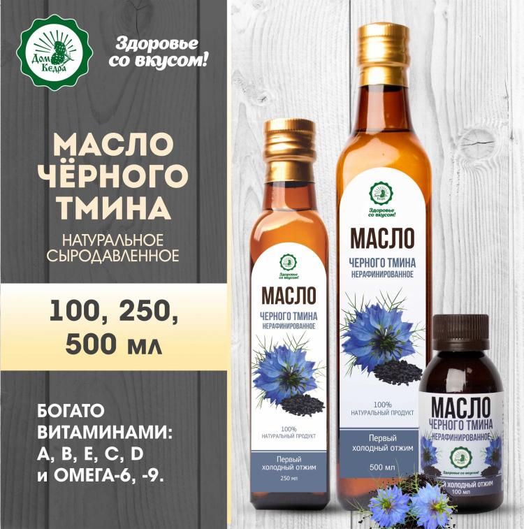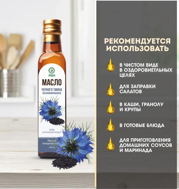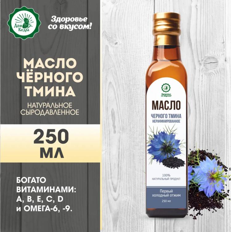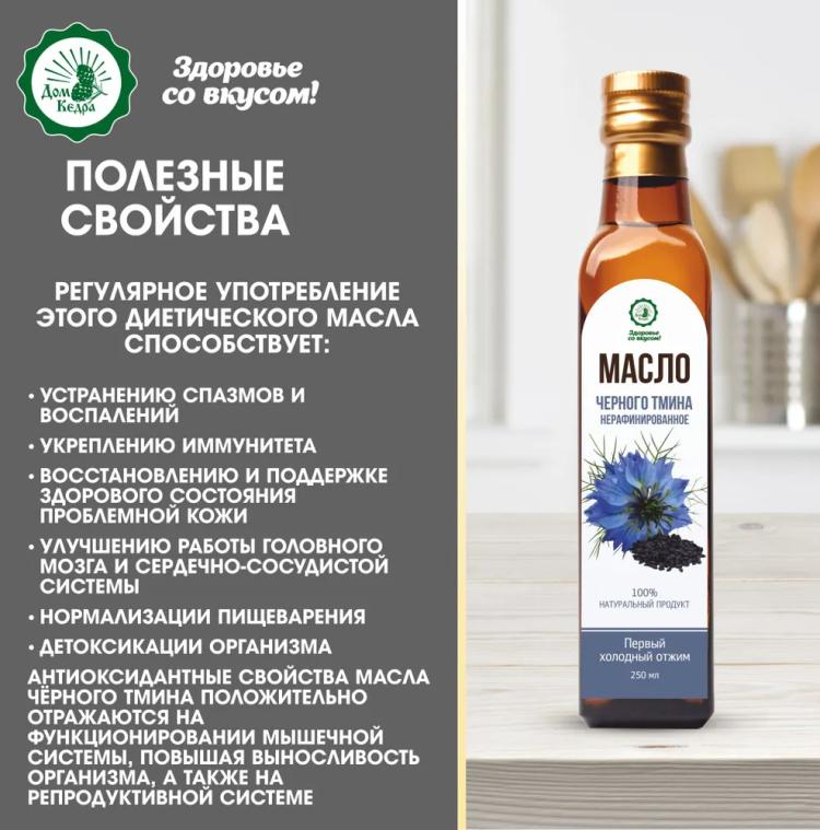 Отличается насыщенным пряным ароматом и горьковатым вкусом. Содержит кислоты ОМЕГА-3, -6, -9, витамины и микроэлементы, необходимые для нормализации всех систем организма. Используется для ухода за проблемной кожей, при наличии воспалений и дерматитов. Оказывает антибактериальное, регенерирующее и противогрибковое воздействие. Употребляется в составе заправок салатов, супов, горячих блюд. Кроме того, в масле тмина много бета-каротина, кальция, железа, меди и других макро- и микроэлементов, витаминов, особенно A, E и D, аминокислот, флаваноидов, фитостеролов, дубильных веществ, эфирных масел, также присутствуют сапонины и энзимы. Несмотря на активное применение данного продукта в лечении различных заболеваний, масло черного тмина не относят к лекарственным средствам. Готовый продукт обладает высоким тонизирующим действием, при регулярном использовании способствует повышению деятельности мозга. Масло тмина также известно своим положительным воздействием на нервную и пищеварительную системы, в последнем случае