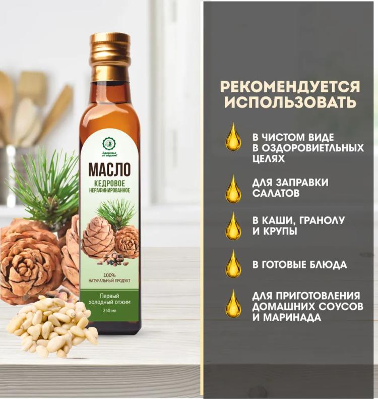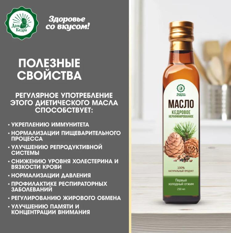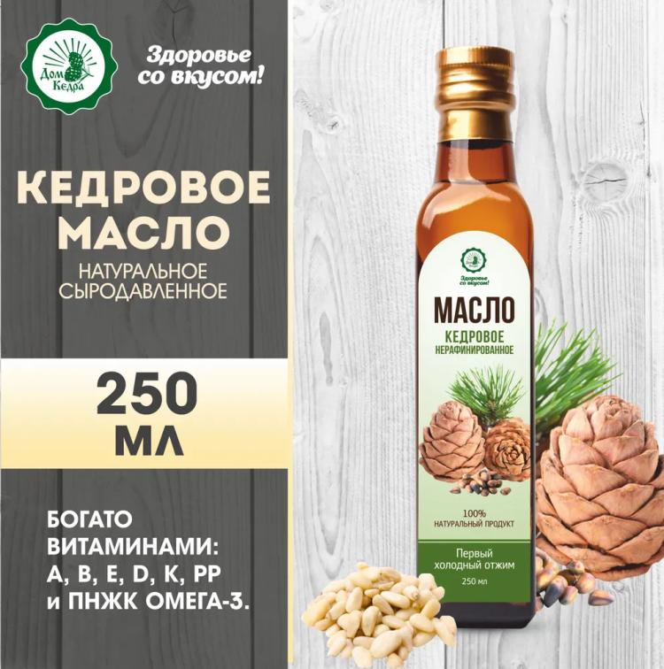 Частичка изобильного богатства сибирской земли – кедровая сосна, или сибирский кедр, приносящий плодами вкуснейшие кедровые орехи. Помимо их незабываемого вкуса и пользы, из кедровых орехов также получается превосходное масло. Янтарный блеск и головокружительный ореховый аромат кедрового масла способны свести с ума любого гурмана. Оно незаменимо при заправке салата и способно в считанные секунды придать неповторимый оттенок мясному блюду. Основные свойства: улучшает "