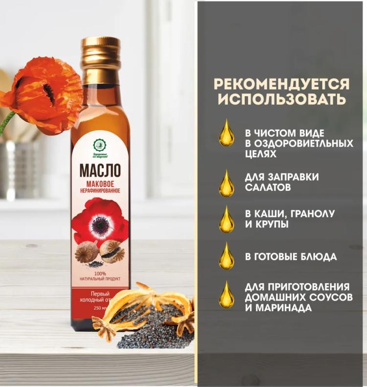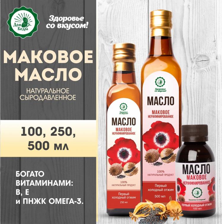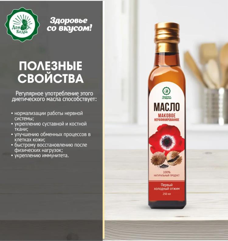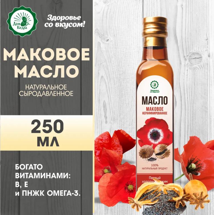 Масло из семян мака – это раритет, оно по праву считается деликатесным. Его появление на российском рынке – это новость, которая уже начала вызывать первые волны любопытства. Уникальные свойства макового масла используют в кулинарии, медицине, а также в производственной отрасли. Масло семян мака используют в фармакологии для производства лекарственных препаратов. Кроме того, маковое масло входит в состав мыла и различных косметических средств. Маковое масло не выделяется наличием ярко выраженного аромата, но обладает приятным ореховым вкусом. В химическом составе макового масла содержится большое количество ненасыщенных жирных кислот типа Омега-3, которые к слову считаются незаменимыми для человеческого организма, так данный вид кислот организмом самостоятельно не вырабатываются. Маковое масло содержит линоленовую, пальмитиновую, а кроме того олеиновую кислоты. Помимо того, химический состав макового масла обогащен стеринами, летучими соединениями и капроновыми кислотами. Маковое масло уникально тем, что в