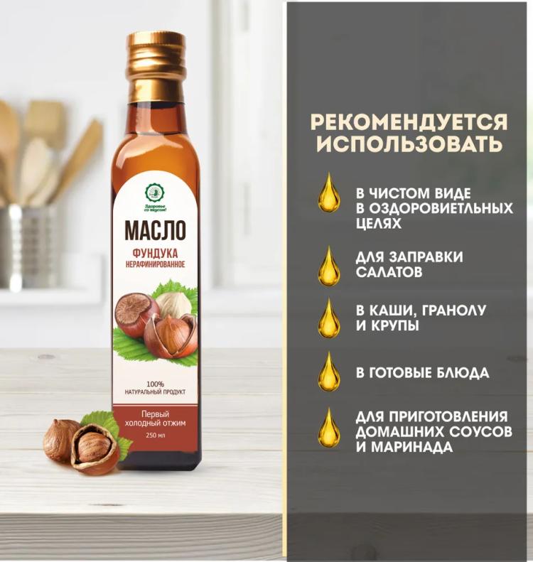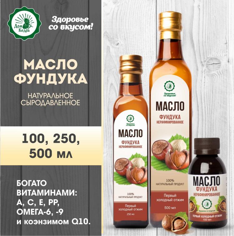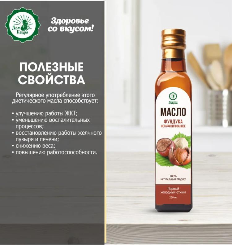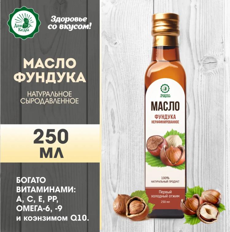 Масло из вкуснейшего фундука добывают прессованием ядер без подогрева. Легкое и текучее, очень ароматное, оно отличается повышенным содержанием олеиновой, пальмитиновой, линолевой, стеариновой кислот, высокой энергетической ценностью, достаточной насыщенностью витаминами Е, РР, В и С. В фундуковом масле много токоферолов и каротиноидов, фосфора, меди, железа и кальция, а также стеринов. Этот продукт пользуется особым доверием женской части аудитории, поскольку в нашей стране неоднократно публиковались исследования о свойстве масла фундука, принимаемого наружно и в пищу, омолаживать кожу лица. Приверженцев этого продукта не смущает даже достаточно высокая розничная стоимость масла фундука. Масло из лесного ореха великолепно ложится на кожу, распределяясь поразительно легко и равномерно. При этом оно практически невесомо, моментально впитывается, оказывая освежающее, матирующее, стягивающее поры воздействие. Наиболее такой эффект выражен на жирной и проблемной коже. После нанесения лесного ореха на коже в сч