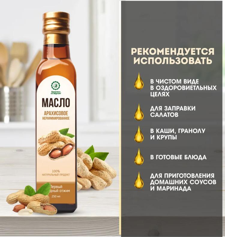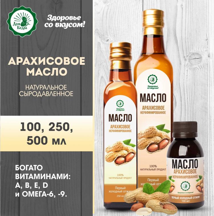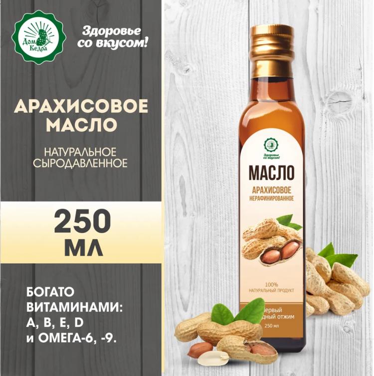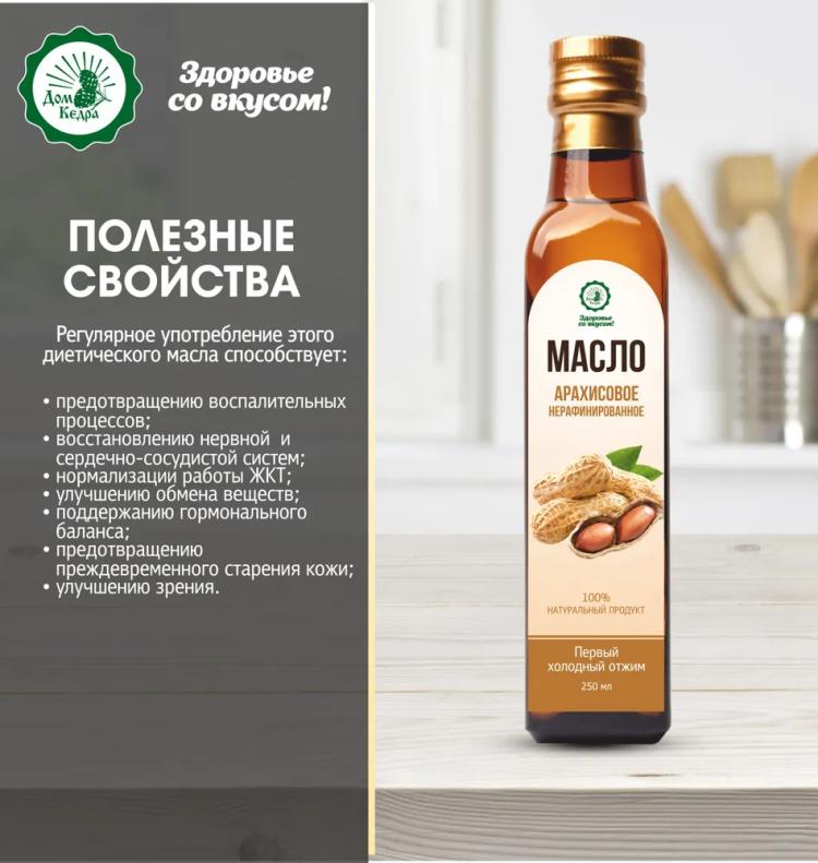 Его успешно применяют для поддержания здоровья, недавние исследования подтвердили его благотворное влияние на сердце. Оно подходит для приготовления салатов, и превосходно используется в косметике. Полезное масло делают из земляного ореха — арахиса, который ошибочно называют орехом. Арахис относится к бобовым и пользуется огромной популярностью по всему миру, ведь по своим свойствам (пищевым и энергетическим) его сравнивают с мясом. Благодаря ореховому вкусу, его используют как закуску во всевозможных вариантах. Масло из этой бобовой культуры довольно широко применяется на родине арахиса – в Парагвае, сейчас оно довольно популярно в странах Азии. Своеобразное сочетание кислот полиненасыщенных способствует оздоровлению организма, восстановлению нервной, половой, сердечной систем, поддержке иммунитета и уровня холестерина, гормонального баланса. Наличие витамина РР или никотиновой кислоты является профилактическим средством, предупреждающим многие заболевания, связанные: с желудком и поджелудочной железой,