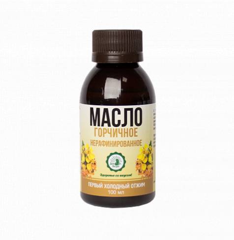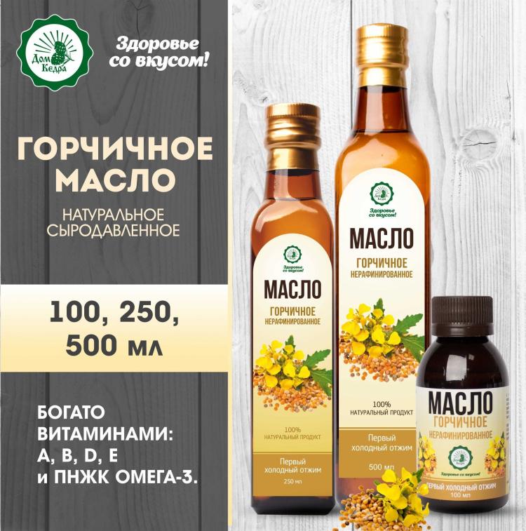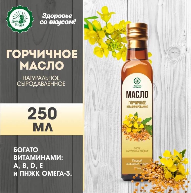 Продукт имеет специфический вкус и характерный горчичный запах. В масле находится много активных веществ: витамины, полиненасыщенные жирные кислоты, фитонциды, фитостеролы, хлорофилл, гликозиды. Также в продукте содержится до 12 % насыщенных жиров. Процентный состав может меняться в зависимости от сорта горчицы, приводим средние показатели: Полиненасыщенные (8-12 % линоленовой (Омега-3), 14-32 % линолевой (Омега-6) и мононенасыщенные Омега-9 жирные кислоты (22-30 % олеиновой, до 5-42 % эруковой) в сочетании: стабилизируют работу сосудов и сердца