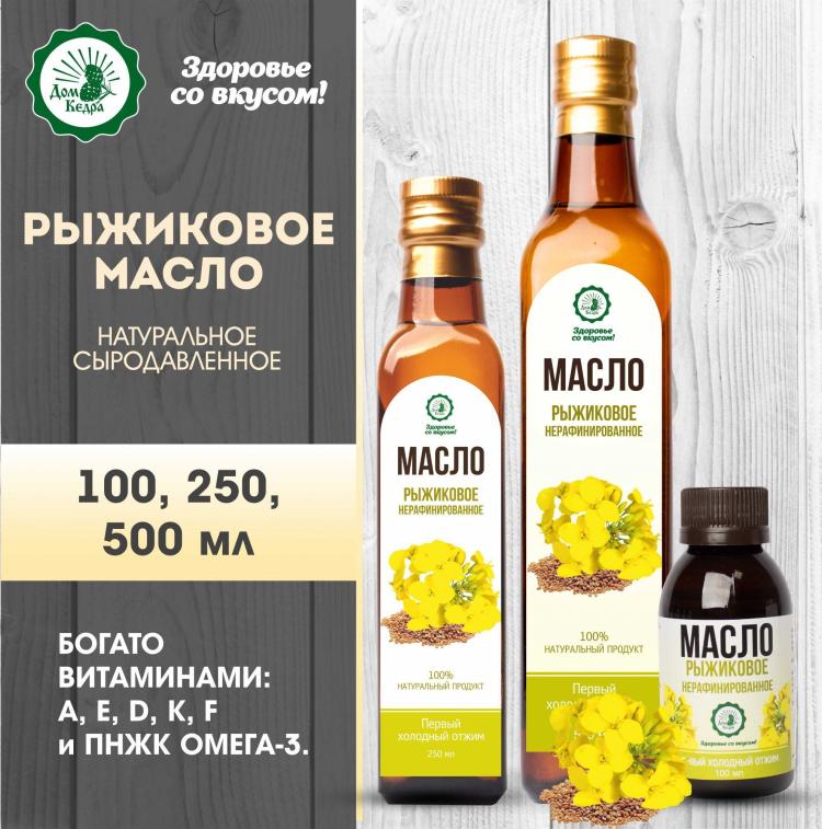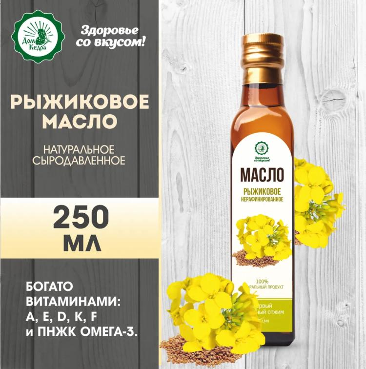 Масло рыжика является уникальным по своему составу: в составе масла количество жирных кислот и белков практически одинаково (жирного масла в рыжиковой базе присутствует не более 40 процентов, а количество белков составляет почти треть всего объема). У рыжикового в составе присутствуют большие доли витамина Е, бета-каротина, стеролов. Косметологические характеристики определяются превалированием линоленовой и гондоиновой кислот и большой долей магния. Доминирование полиненасыщенных кислот фактически превращает рыжиковое масло в активный носитель керамидов, растительный источник витамина F. Несмотря на высокую устойчивость к окислению, масло содержит не только антиоксиданты, фосфолипиды, но и хлорофилл, и каротиноиды. Из витаминного состава также следует отметить высокие показатели витаминов D, K и A. Масло из рыжика считается одним из наиболее мощных антиоксидантов: 10 г масла содержат суточную дозу необходимого организму витамина Е. При приеме внутрь масло оказывает общеоздоровительное воздействие, предуп