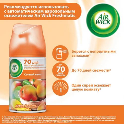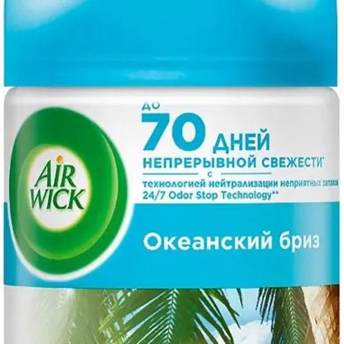 Сменный баллон для автоматического освежителя воздуха AirWick с ароматом Океанский бриз, Голубая лагуна. Сменный флакон освежителя используется в автоматическом диспенсере Air Wick Freshmatic для устранения неприятных запахов, создания свежести и комфортной атмосферы с помощью приятных ароматов. Аэрозольный освежитель воздуха Эрвик можно использовать как для дома, так и в офисах, магазинах, ресторанах, общественных зданиях для нейтрализации запахов в туалетах, ванных комнатах, кухнях,помещениях для курения. Одного аэрозольного спрея Air Wick достаточно для поддержания аромата до 70 дней в одной комнате. Точное время использования ароматизатора зависит от настроек интенсивности распыления, установленных на автоматическом распылителе Airwick Freshmatic.