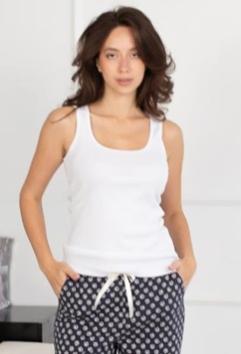 Описание: Майка-топ для дома и отдыха из трикотажного полотна, среднее плечо. Лиф переда двойной. Горловина и проймы обработаны узкой окантовокй. По низу изделия жаккардовая резинка. Состав: 92% хлопок, 8% эластан