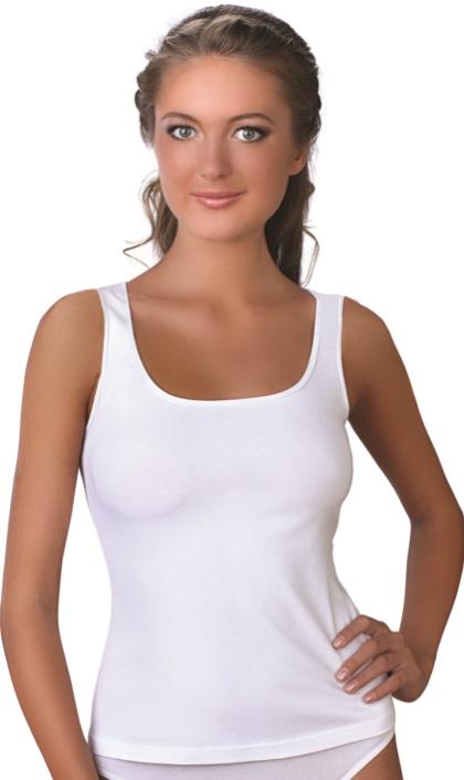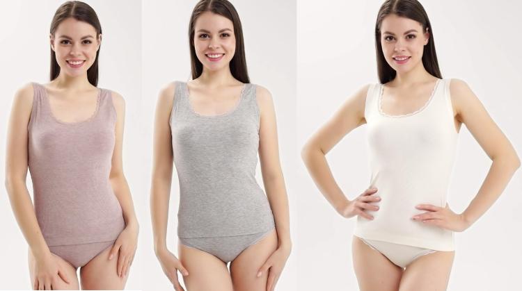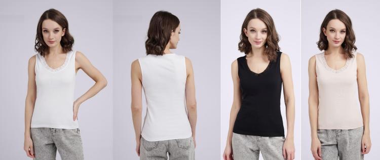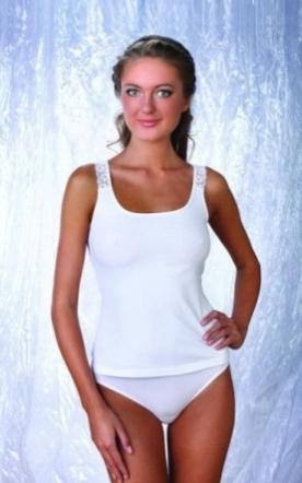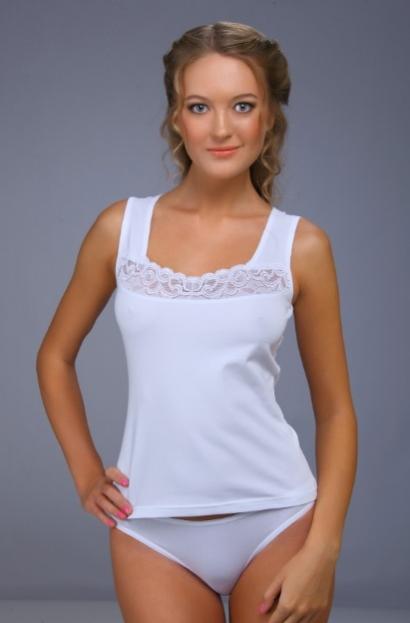 Майка женская. Бретель средней ширины с декоративной вставкой из кружева, которое придаёт изделию нарядность. За счёт ширины бретели майка будет не заметна под изделиями с расширенной горловиной. Состав: 75% Хлопок, 20% полиэстр, 5% эластан.