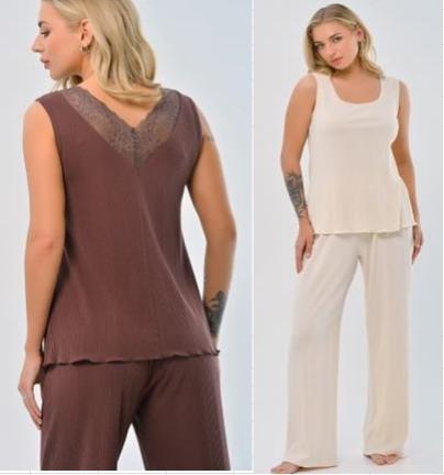 Описание: Майка для дома и отдыха из вискозного трикотажного полотна кашкорсе лапша. Среднее плечо. Округлый вырез горловины. По горловине узкое кружево, по пройме обтачка. Состав: 90% вискоза, 10% эластан