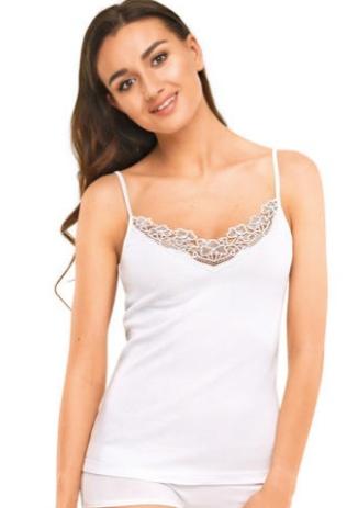 Базовая, малообъемная майка из трикотажного, эластичного полотна. V-образная горловина обработана кружевом. Широкая бретель. 100% хлопок