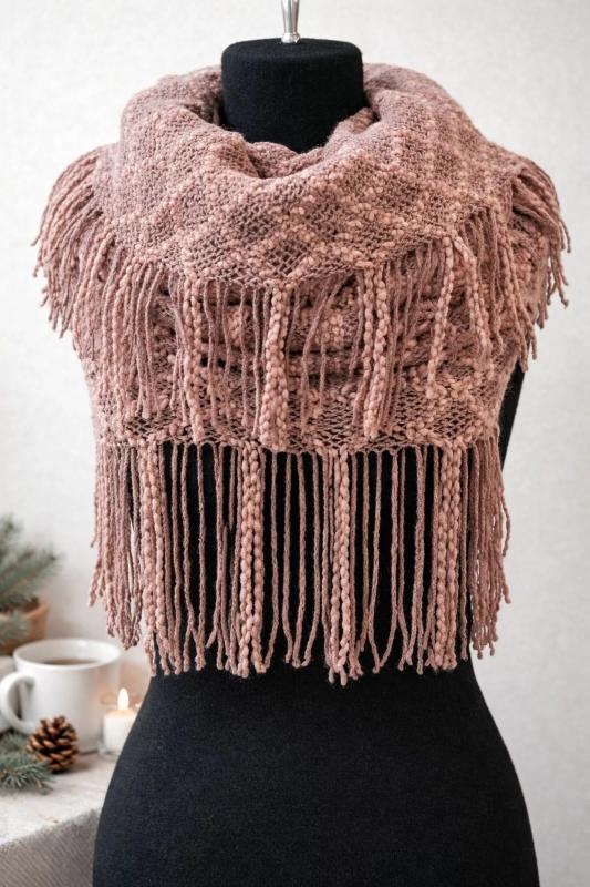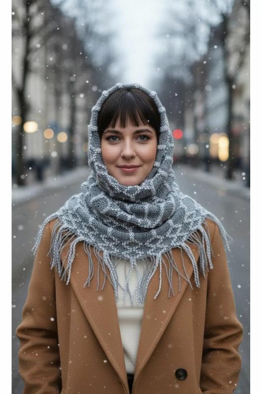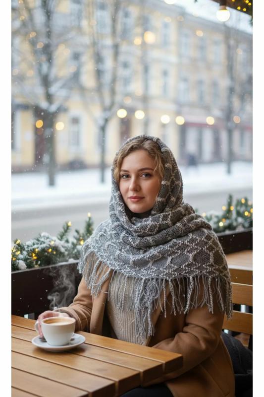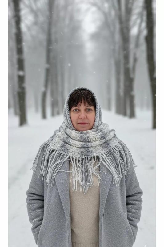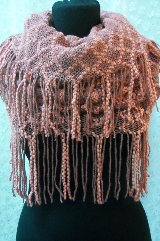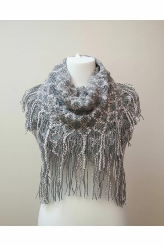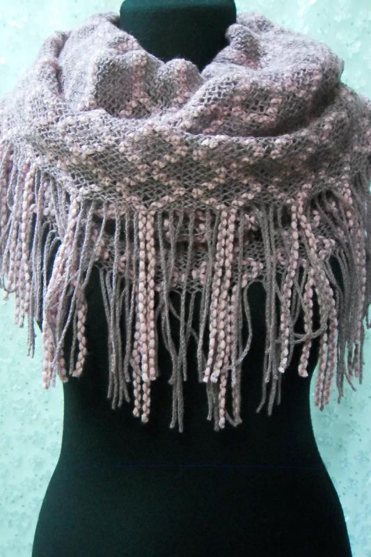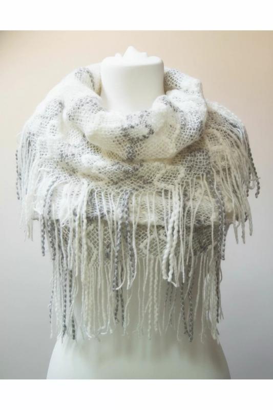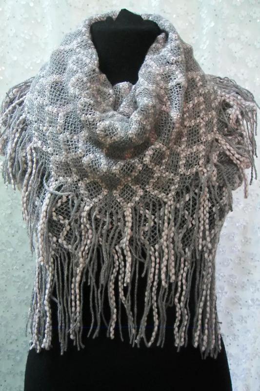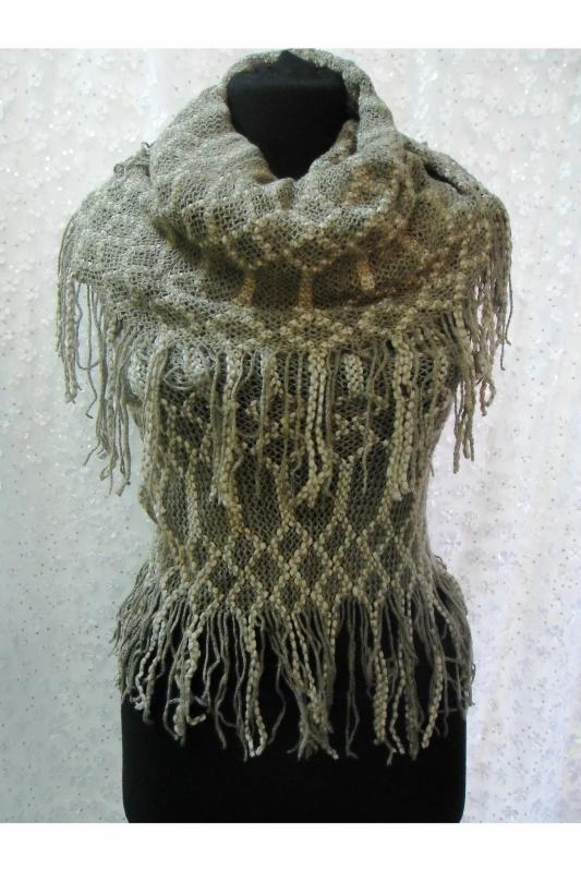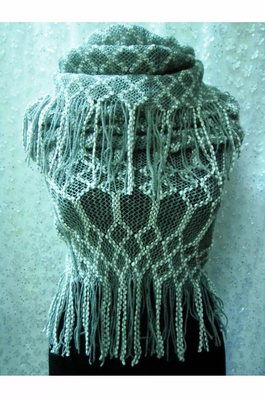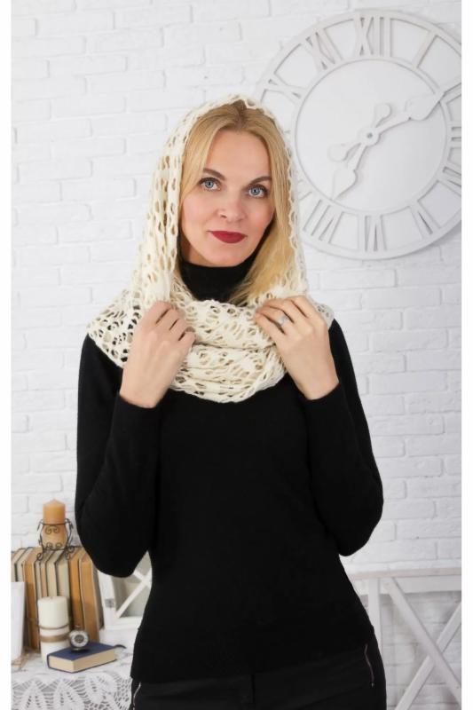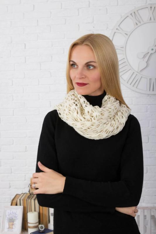 Шарф-снуд женский выполнен из шерстяного сетчатого кружевного полотна. Края изделия не обработаны. Деталь шарфа стачана между собой. Размер 76*50 см