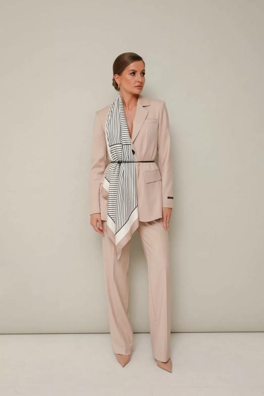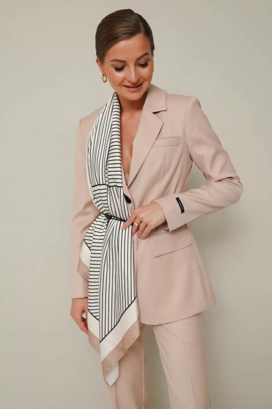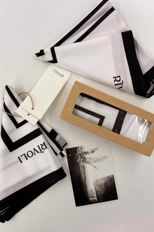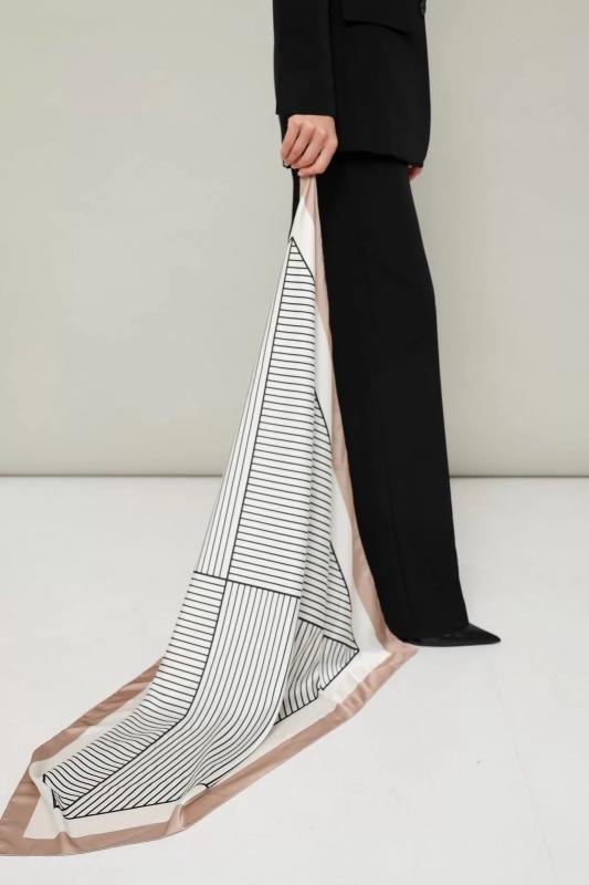 Платок с геометричным принтом. Выполнен из струящейся ткани с благородным матовым блеском. Вариант стилизации: аксессуар можно носить как пояс, завязав в узел два противоположных угла. Размер: 90*90см.