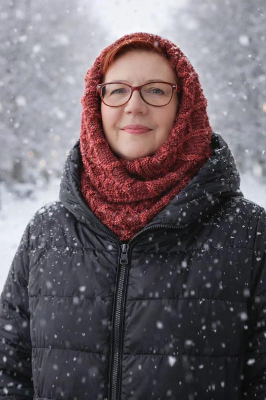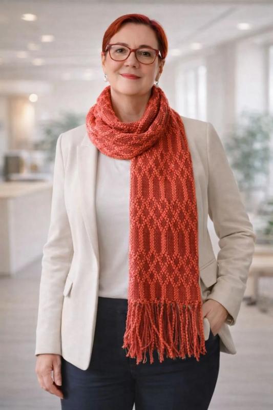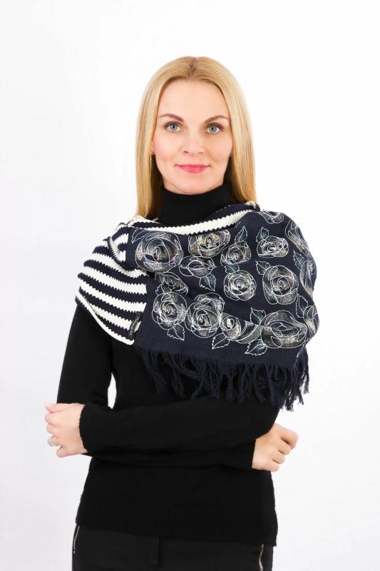 Шарф-снуд женский выполнен из трикотажного полотна с льняной вставкой прямоугольной формы. По краям вставки выполнена бахрома длиной 7 см. На вставке изо льна выполнена ручная художественная роспись специализированными красками по ткани. Рисунок закреплен, подлежит стирке в стиральной машине на декликатных режимах. Размер 85*42 см