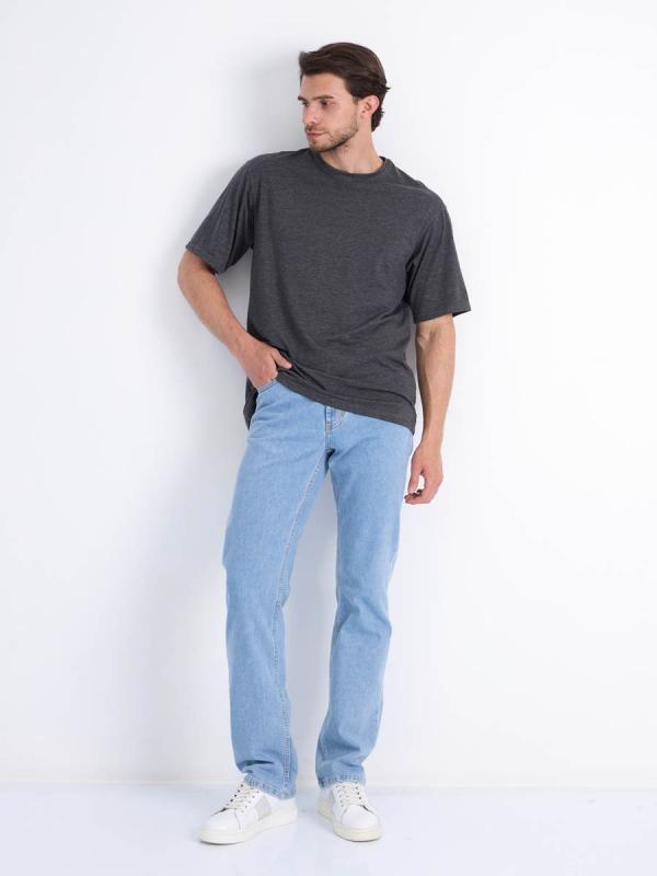 Мужские классические джинсы с пятью карманами. Посадка Regular fit (полуоблегающие по бедру), средняя высота талии. Застежка на молнии. Немного зауженные к низу. Выполнены из слабоэластичной ткани denim comfort stretch. Средняя стирка с потёртостями и "