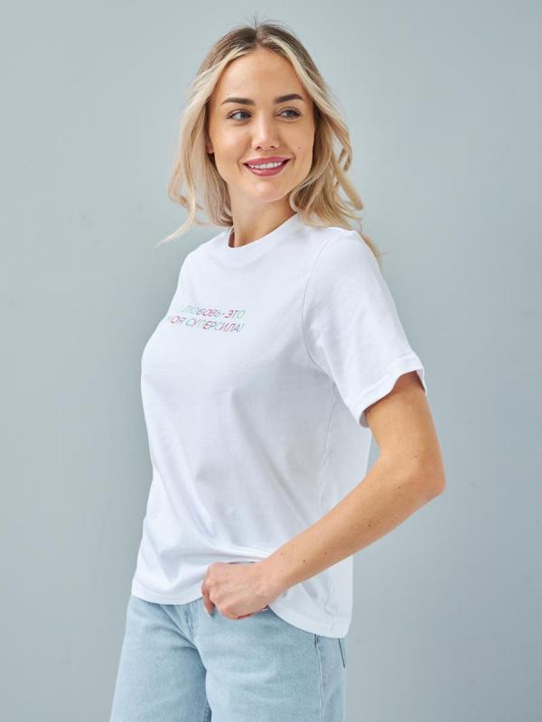 Женская футболка F5, Comfort fit (свободный силуэт), круглый вырез горловины, короткий цельнокроеный рукав с отворотами. Выполнена из классического трикотажного полотна.
