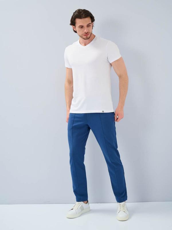 Мужские модные джинсы с пятью карманами. Посадка Slim fit (облегающие по бедру), средняя талия спереди, высокая сзади. Застежка на молнии. Немного зауженные к низу. Боковой шов сделан в разутюжку. Выполнены из слабоэластичной ткани denim comfort stretch, цвет ткани Blue-Black(лицевая сторона ткани темно-синяя, изнаночная сторона- черная). Классическая темная стирка с потёртостями только по швам. Рекомендации по уходу Стирать в стиральной машине при температуре 30°