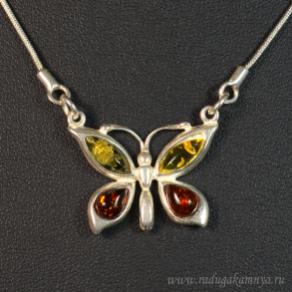 Кулон с янтарём на цепочке в посеребрении "бабочка" 27*23мм ассорти, 47см