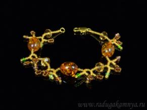 Браслет с янтарем, бисером и цирконом "веточка" коньячный, 20,5см.