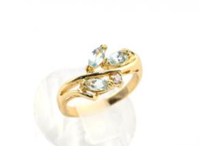 Кольцо с голубым топазом, 3 камня + циркон, украшение из ювелирного сплава с нанесённым гальваническим методом золотым покрытием толщиной 1 микрон со вставками из голубого топаза