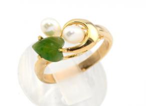 Кольцо позолоченное с жемчугом и нефритом "В ободке", размер 16