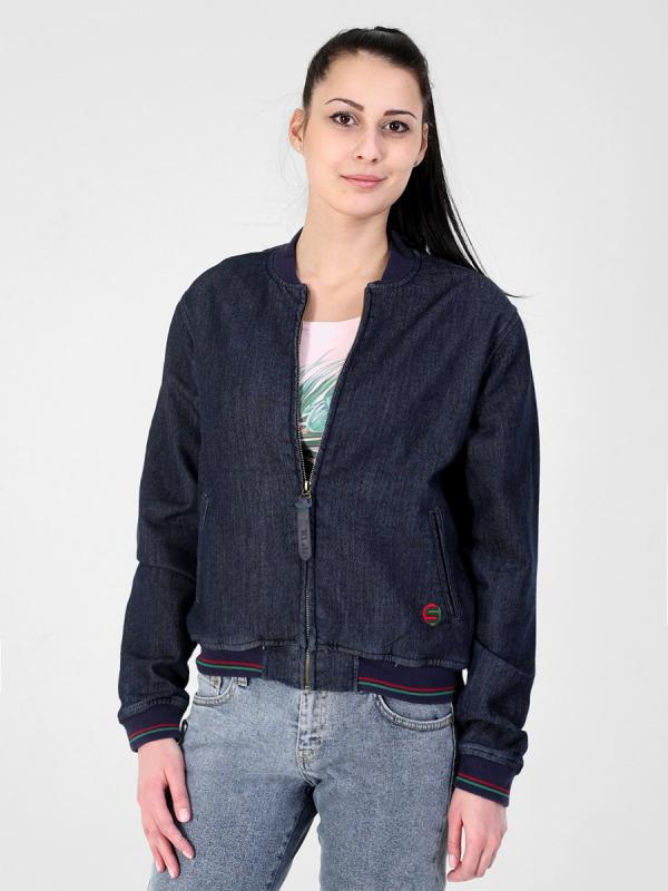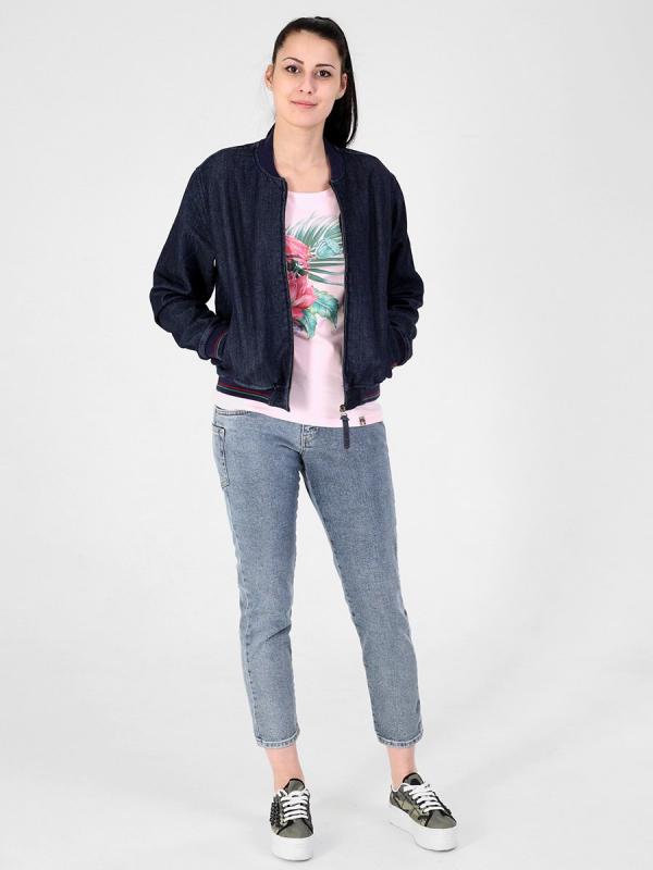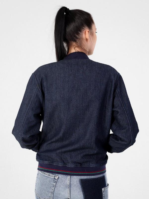 Женский модный бомбер, посадка Regular fit, с застежкой на металлическую молнию, двумя боковыми прорезными карманами «в рамку», рядом с левым карманом вышивка. Воротник-стойка, манжеты и низ бомбера из плотной трикотажной «резинки». Бомбер изготовлен из джинсового трикотажного полотна. Изделие постирано, темная стирка.