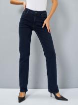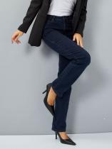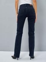 Женские классические джинсы с пятью карманами. Посадка Regular fit (полуоблегающие по бедру). Для улучшения посадки по талии сделан подкройной пояс из 2-х частей. Средняя высота талии спереди и высокая сзади. Застежка на молнии. Немного зауженные к низу. Выполнены из слабоэластичной ткани denim comfort stretch, цвет ткани Blue-Black(лицевая сторона ткани темно-синяя, изнаночная сторона- черная). Темная стирка "