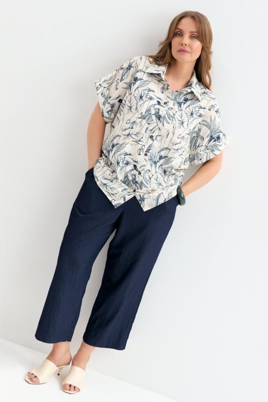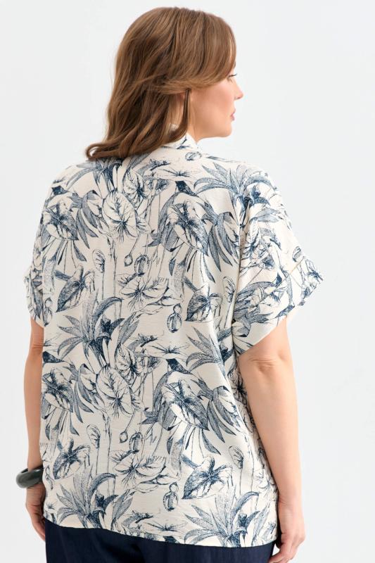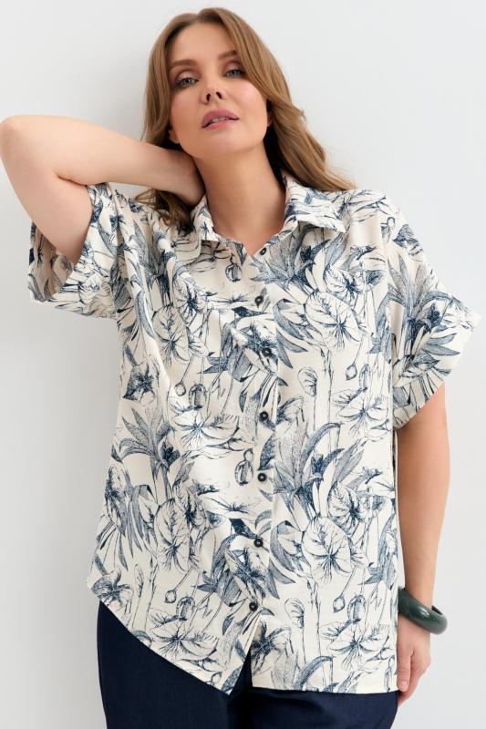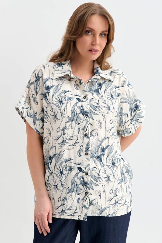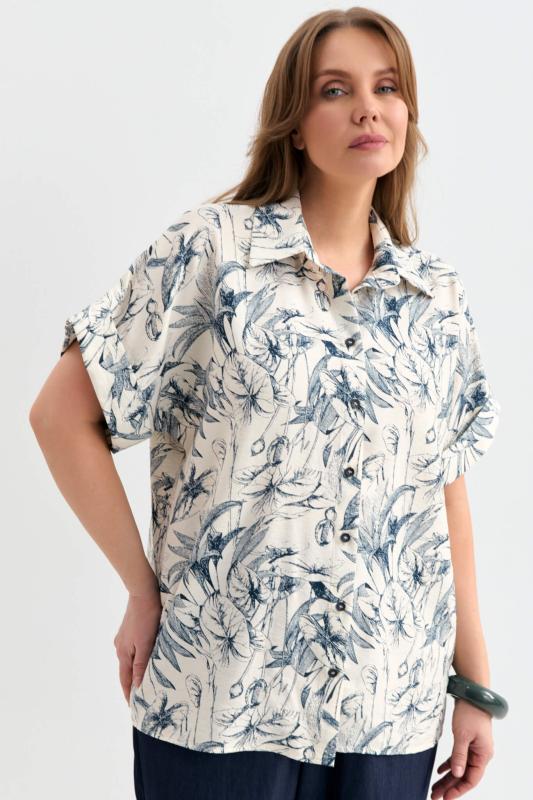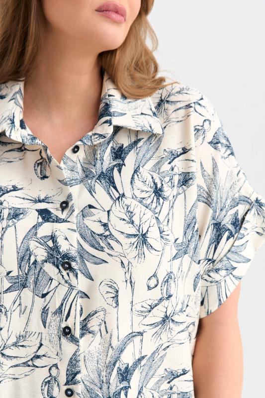 Блуза-рубашка из вискозы с флористическим принтом. Модель прямого силуэта с отложным воротником. Цельнокроеный короткий рукав с отложной манжетой. Застежка на петли и пуговицы.