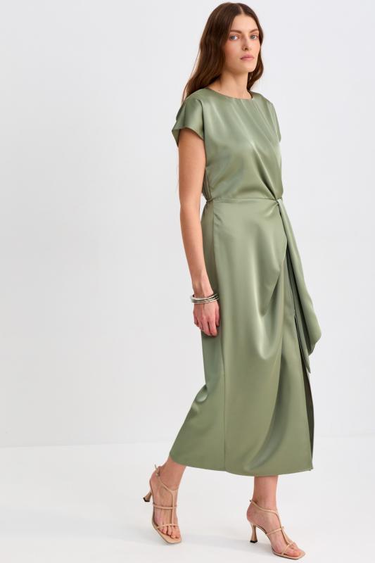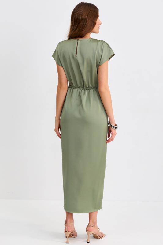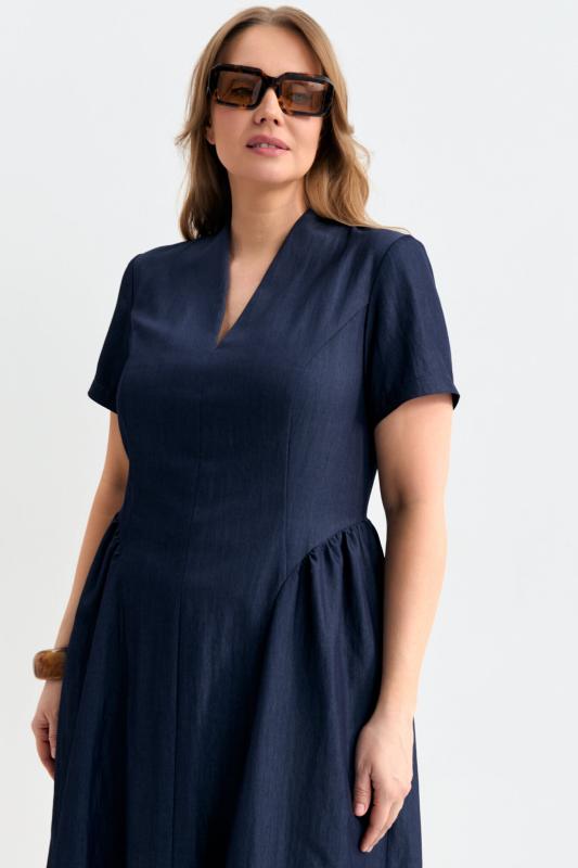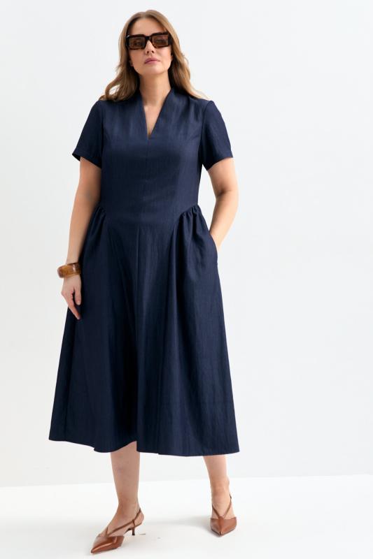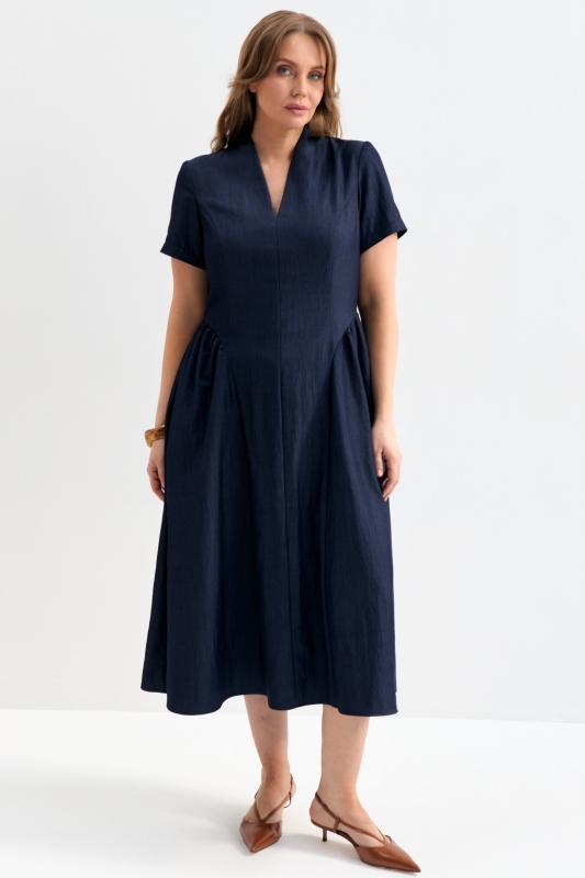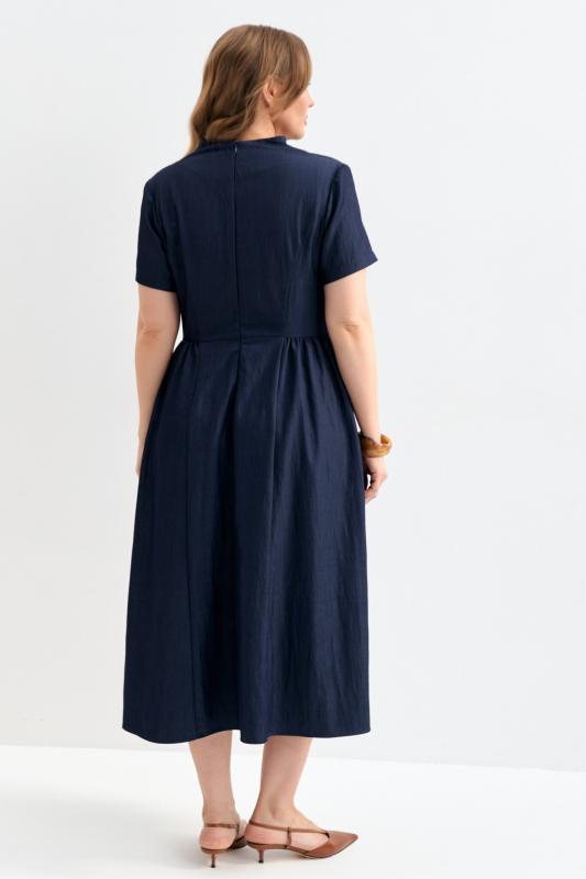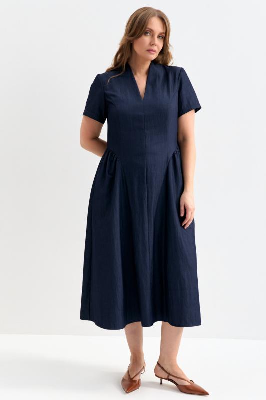 Платье со сборками из тенселя длины миди. Модель полуприлегающего силуэта с расклешенной юбкой. По бокам декоративные вставки со сборками и карманами. Рукав втачной. V-образный вырез переходящий в цельнокроеную стойку. Застежка по спинке на потайную молнию.
