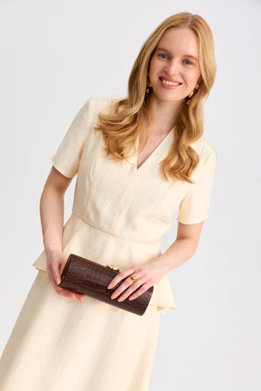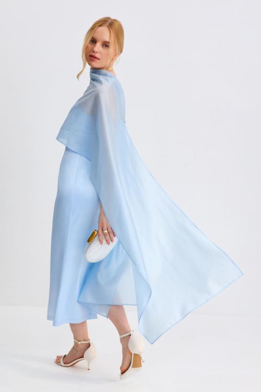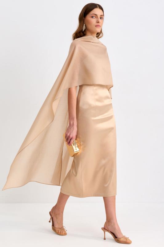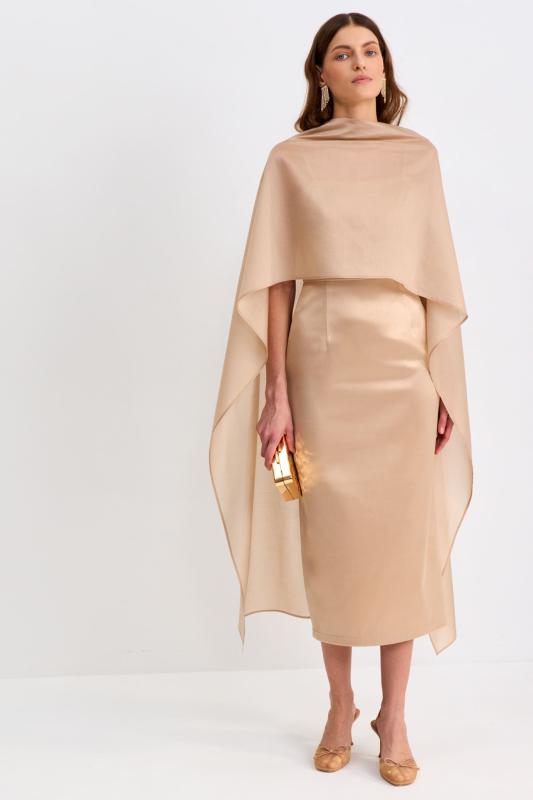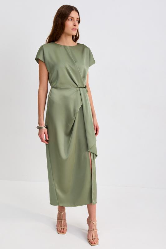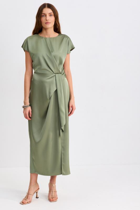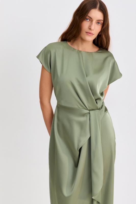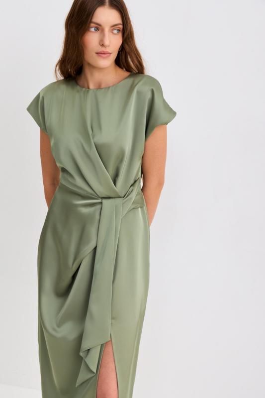 Платье со сборками из тенселя длины миди. Модель полуприлегающего силуэта с расклешенной юбкой. По бокам декоративные вставки со сборками и карманами. Рукав втачной. V-образный вырез переходящий в цельнокроеную стойку. Застежка по спинке на потайную молнию.