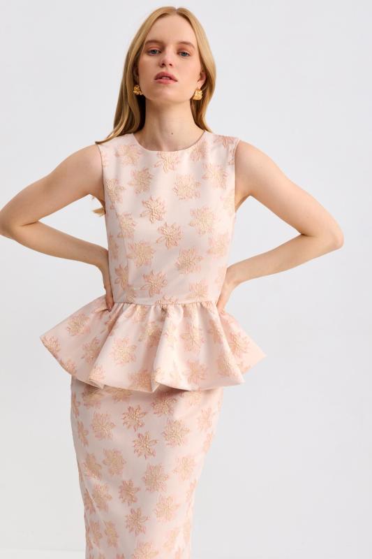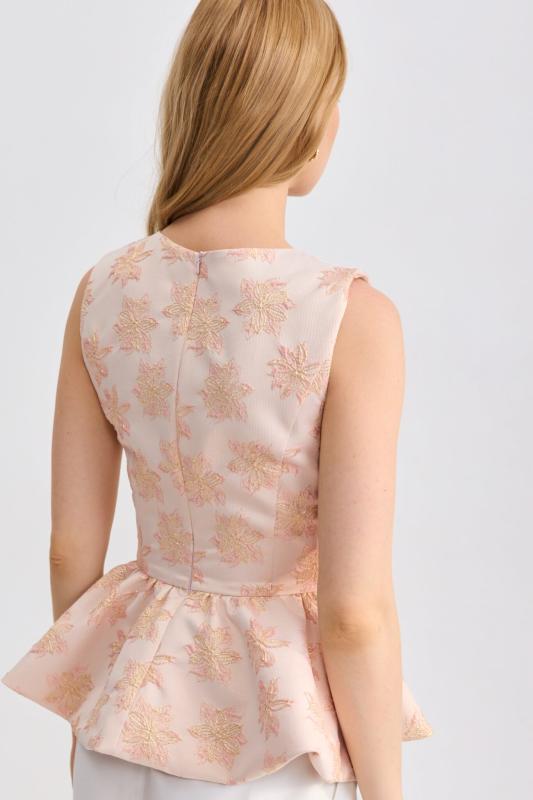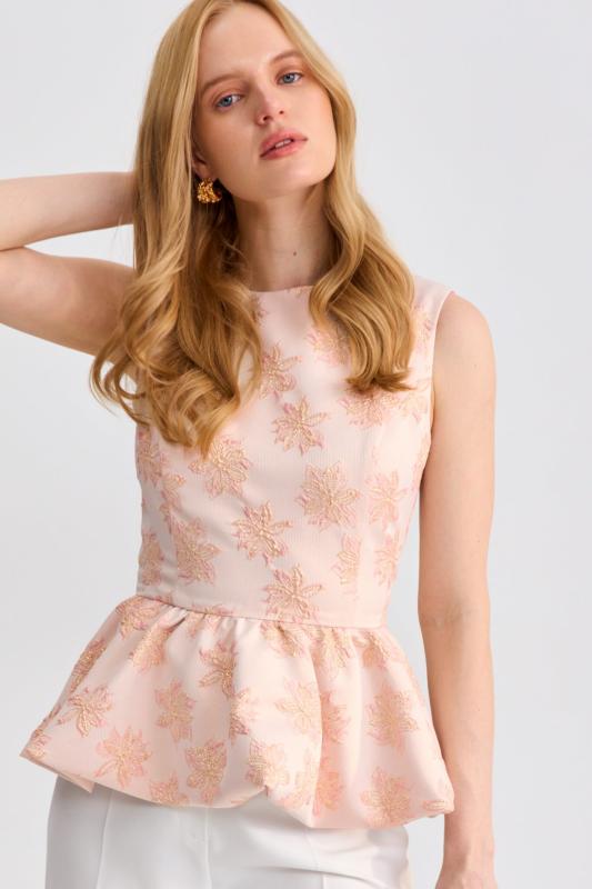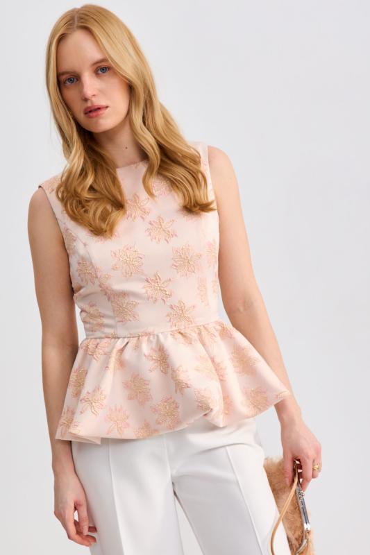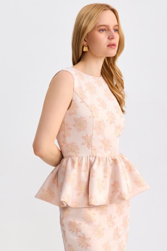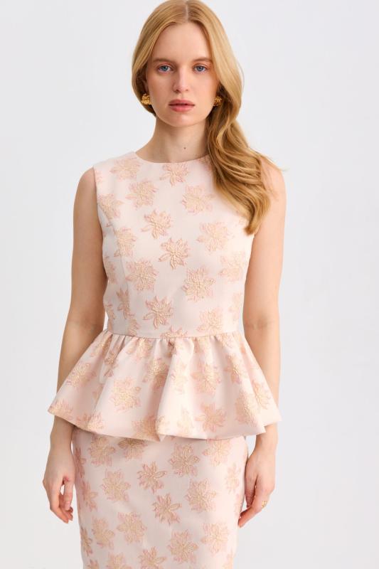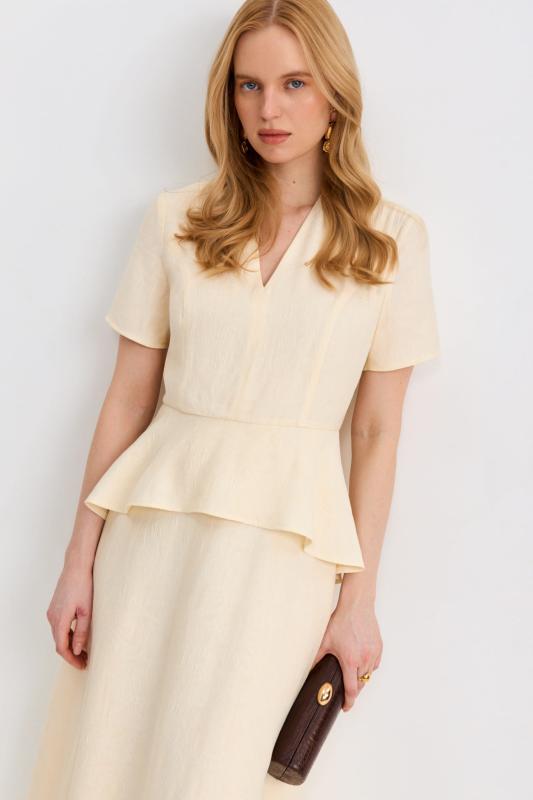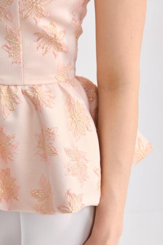 Топ из фактурного жаккарда с эффектной баской. Модель полуприлегающего силуэта, отрезная по линии талии с объемной баской. По спинке застежка на потайную молнию. Изделие полностью на поливискозном подкладе.