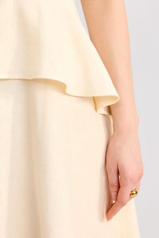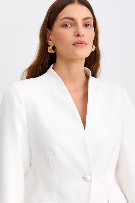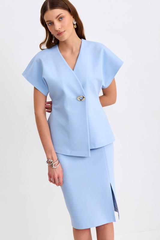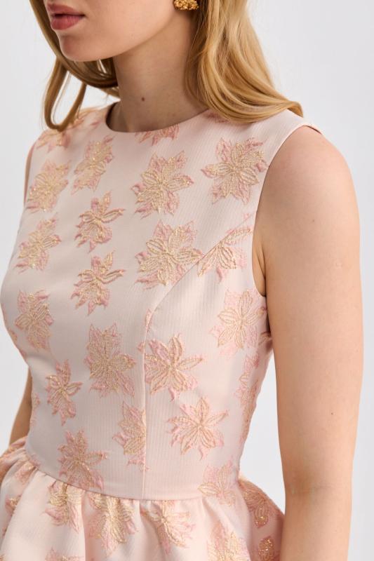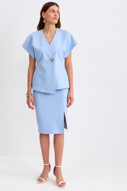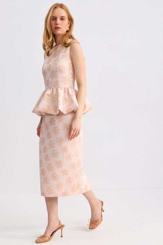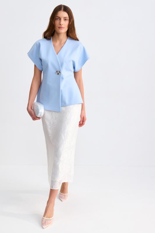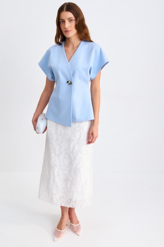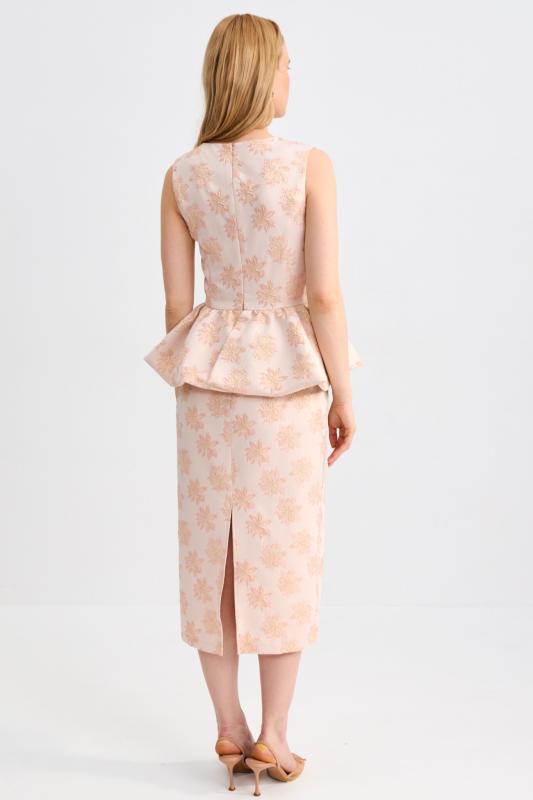 Топ из фактурного жаккарда с эффектной баской. Модель полуприлегающего силуэта, отрезная по линии талии с объемной баской. По спинке застежка на потайную молнию. Изделие полностью на поливискозном подкладе.