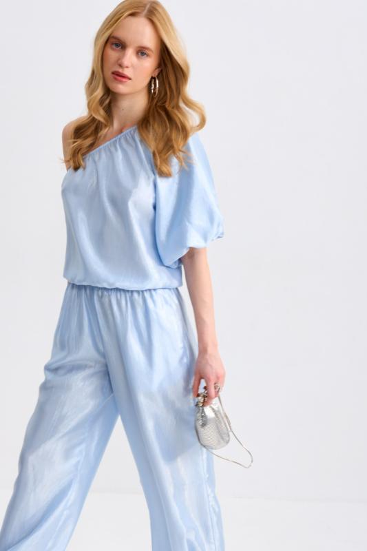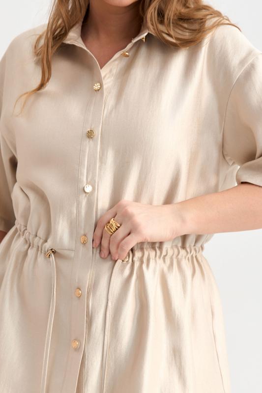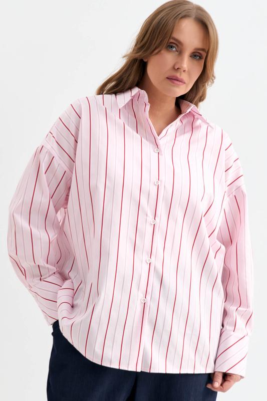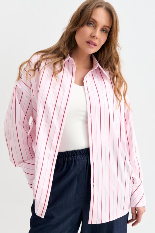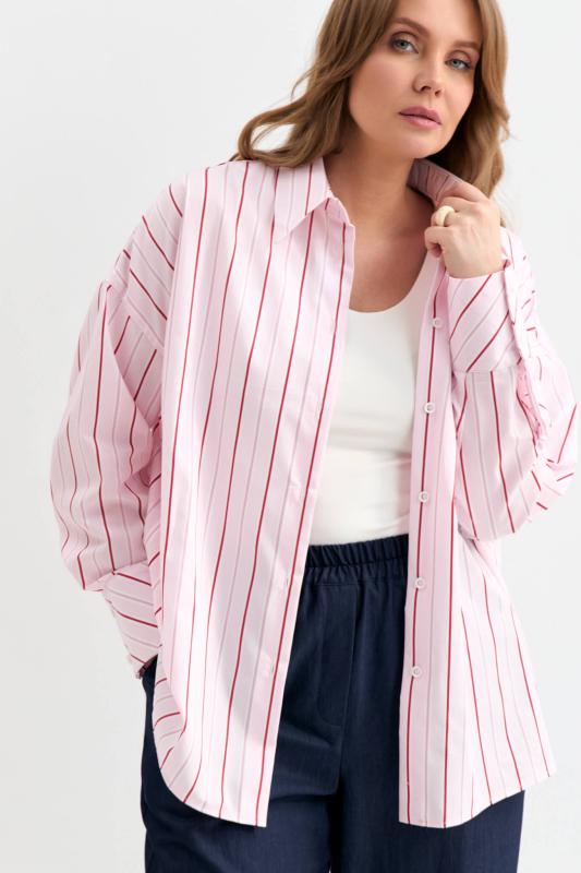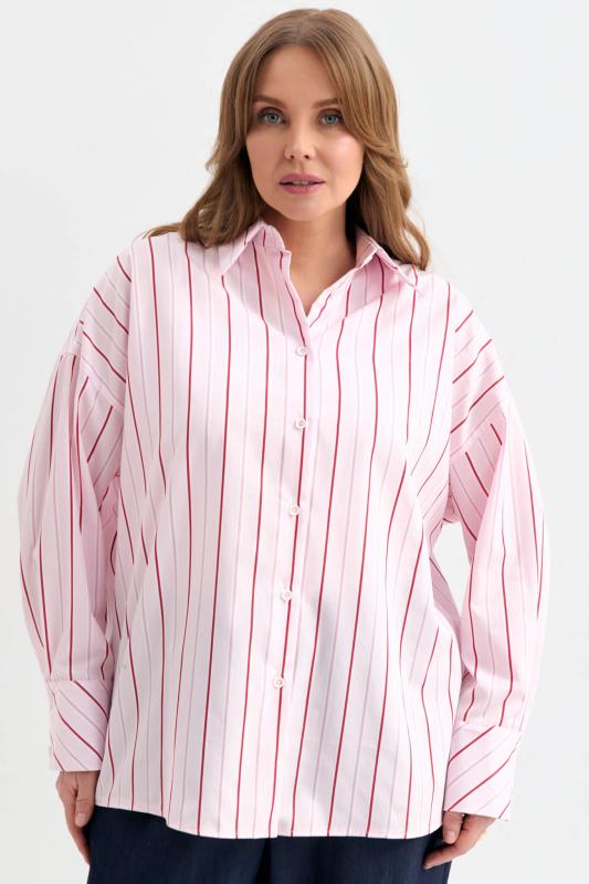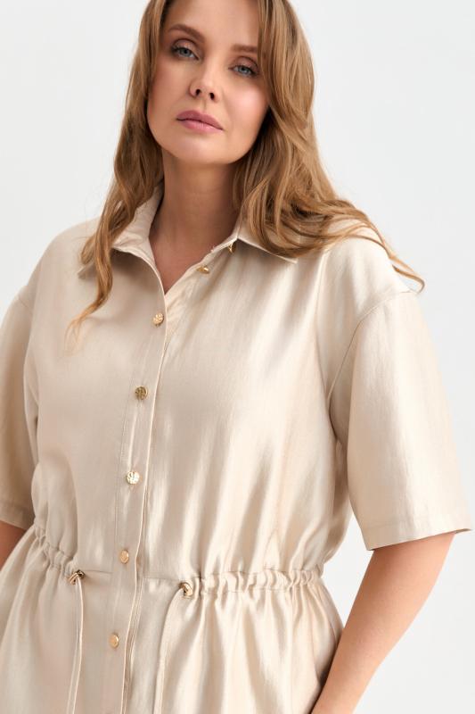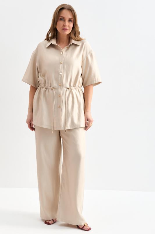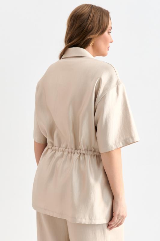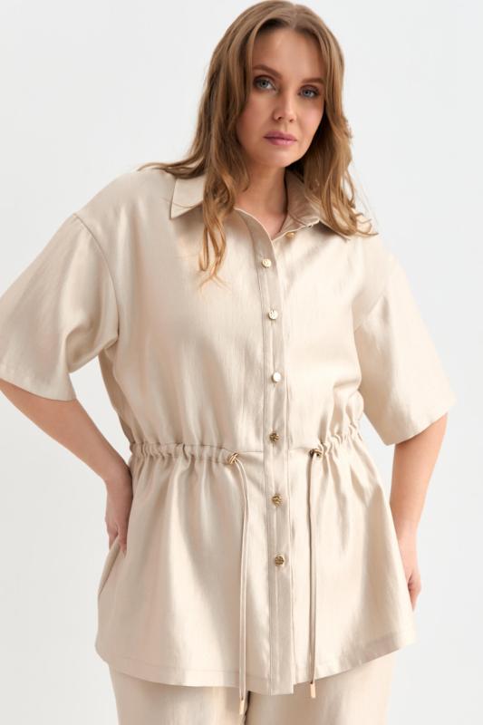 Блуза-рубашка из плотной вискозы с деликатным сиянием. Модель свободного силуэта с отложным воротником, с застежкой на акцентные пуговицы. По линии талии кулиска с резинкой и фиксаторами. Рукав спущенный.