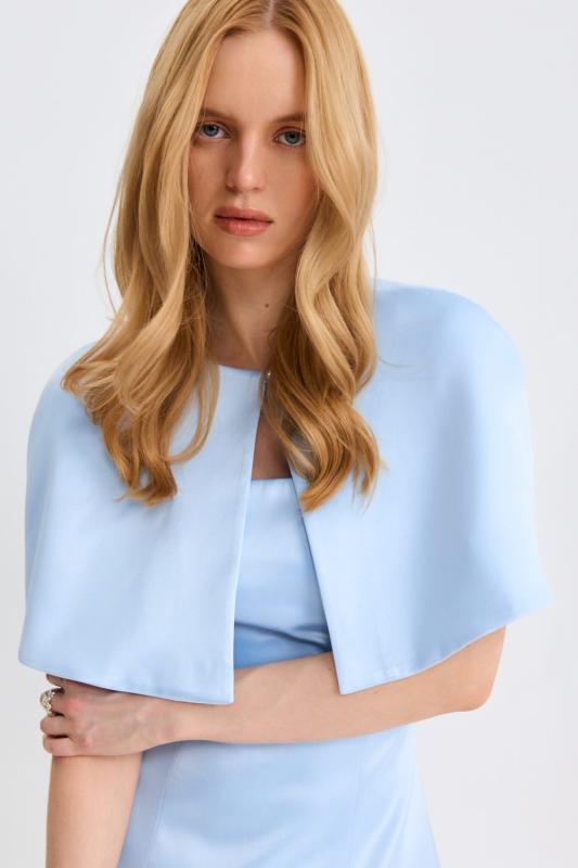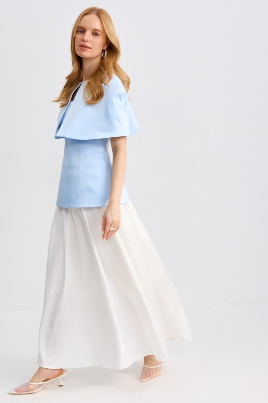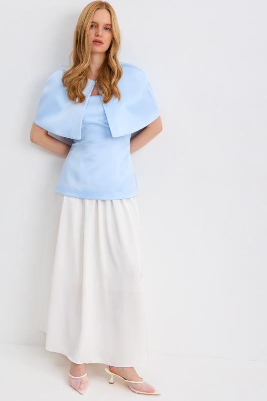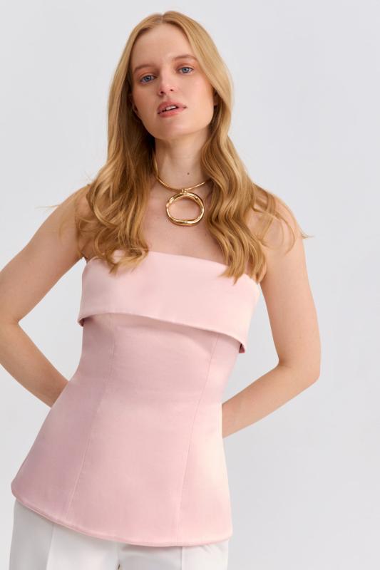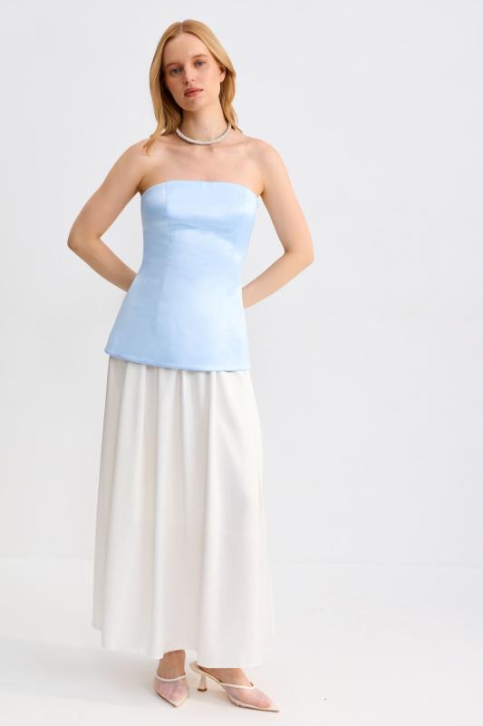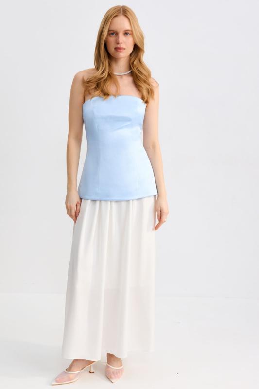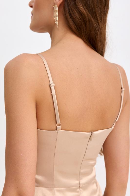 Топ-корсет с регулируемой шнуровкой по спинке из плотного атласа. Модель прилегающего силуэта расширенная к линии бедер с декоративной отлетной кокеткой. По спинке застежка на потайную молнию и шнуровку.