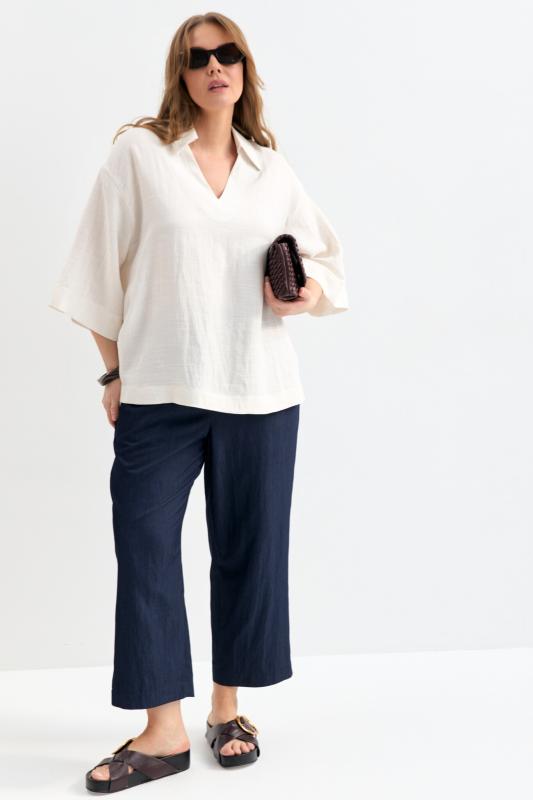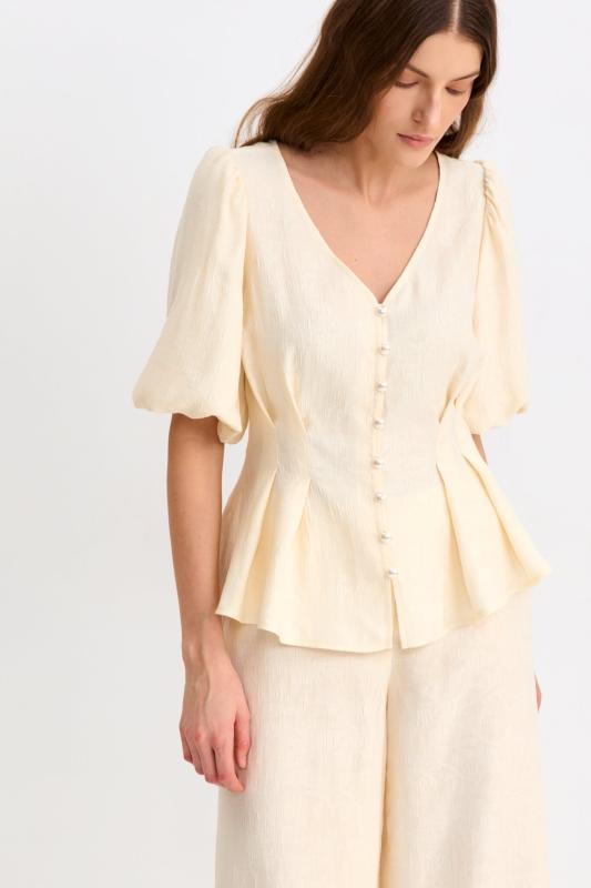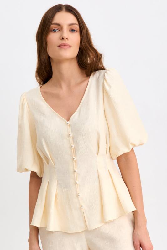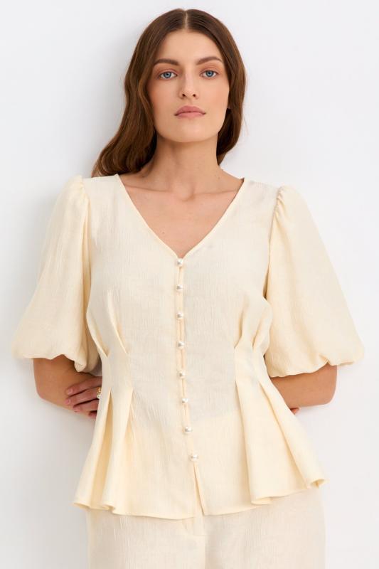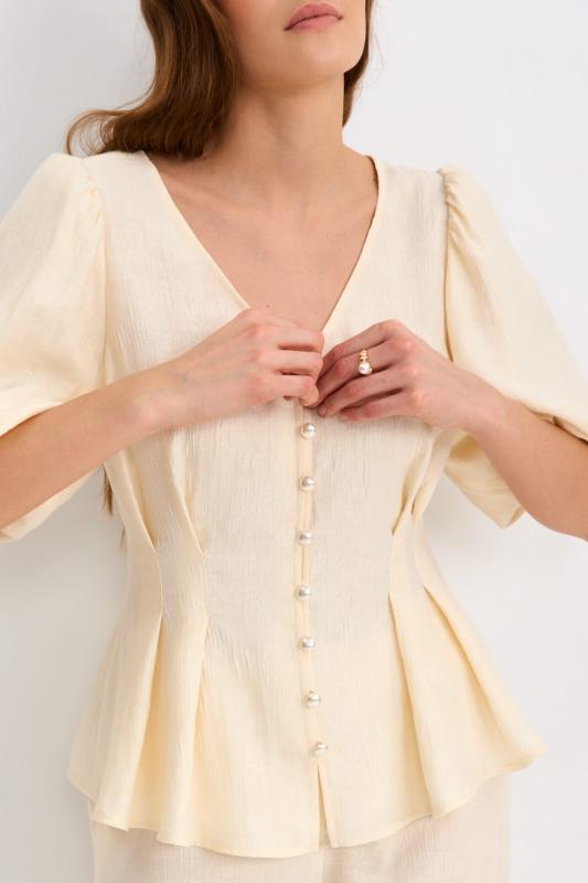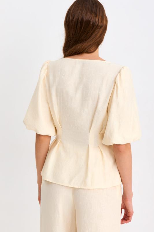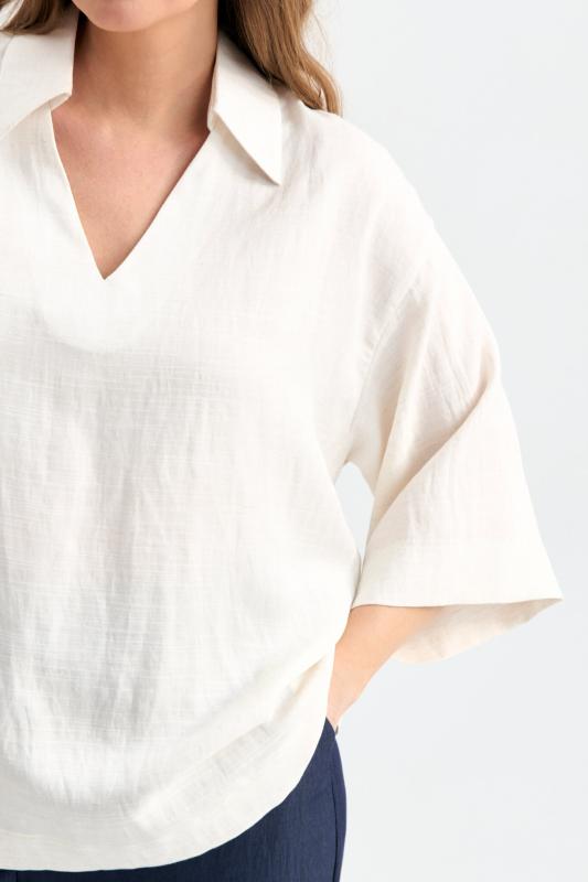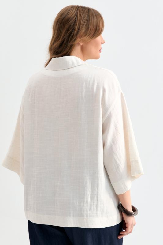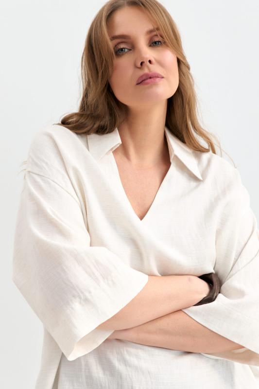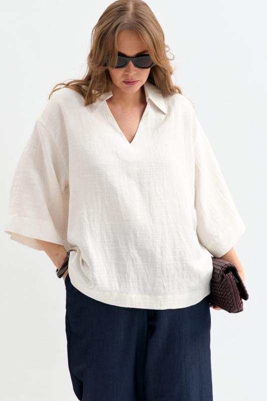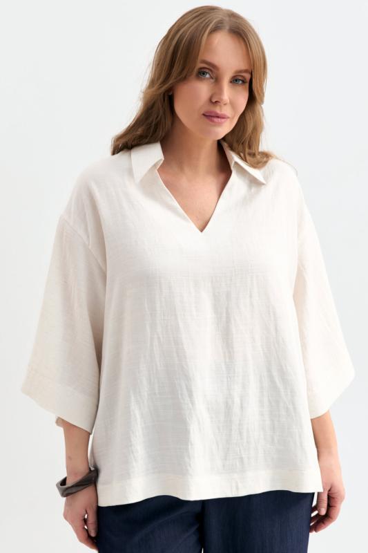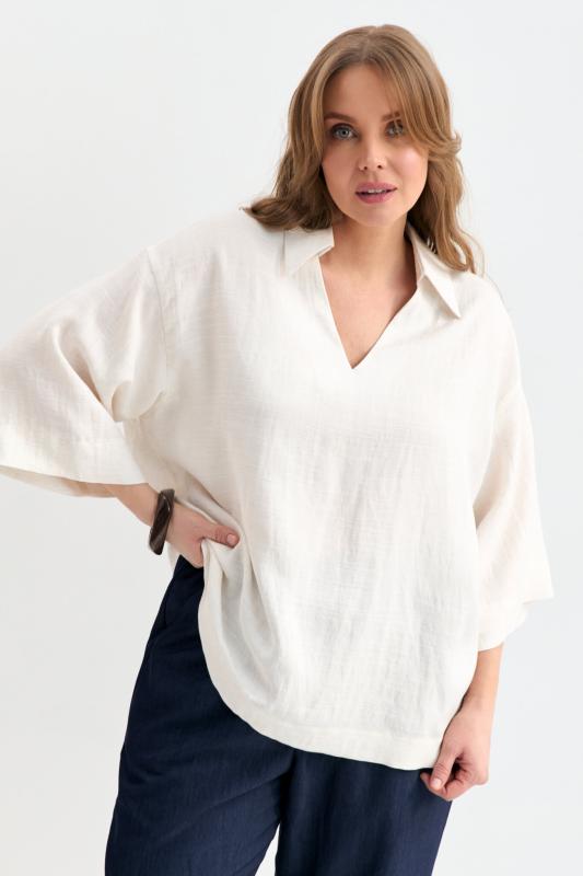 Блуза из фактурной вискозы молочного оттенка. Модель свободного силуэта. По переду V-вырез переходящий в воротник. Рукав спущенный, с широкой декоративной подгибкой.
