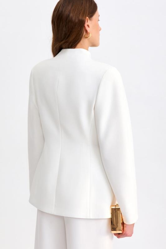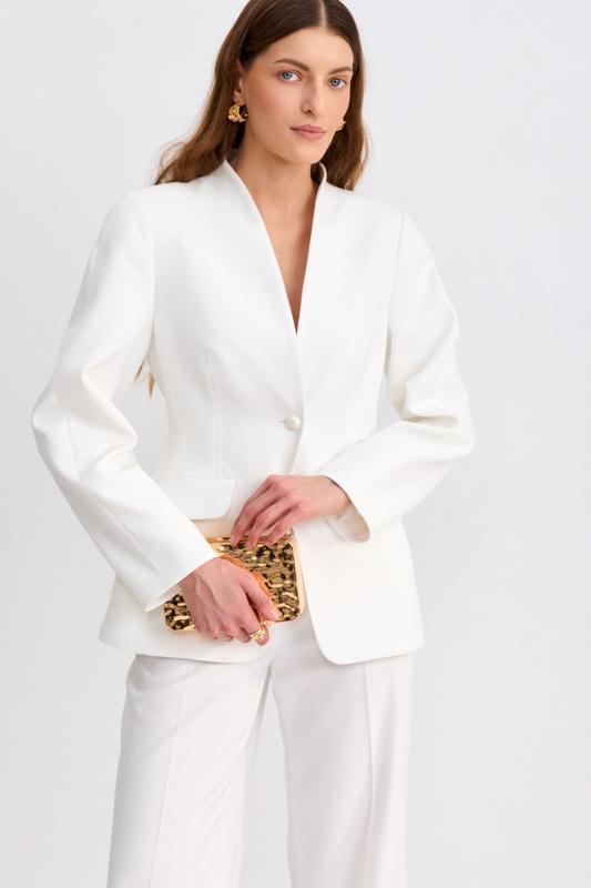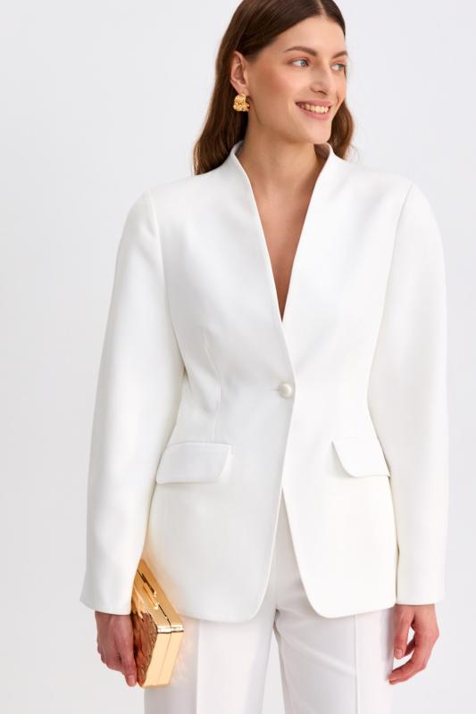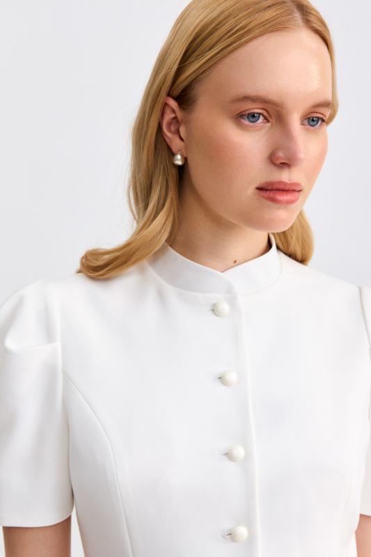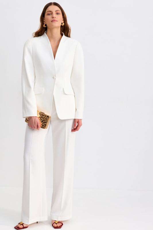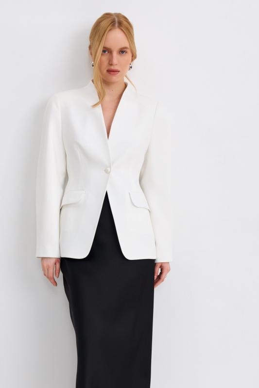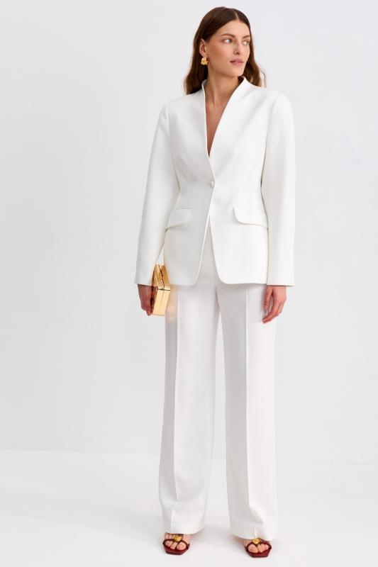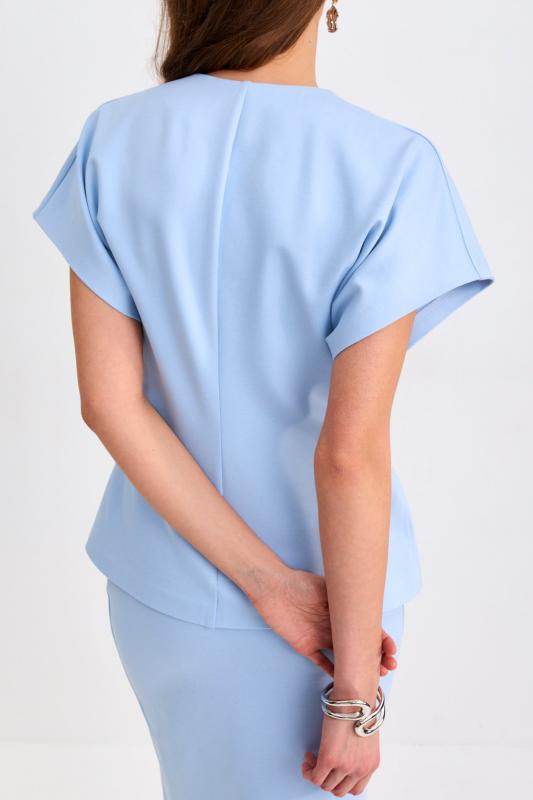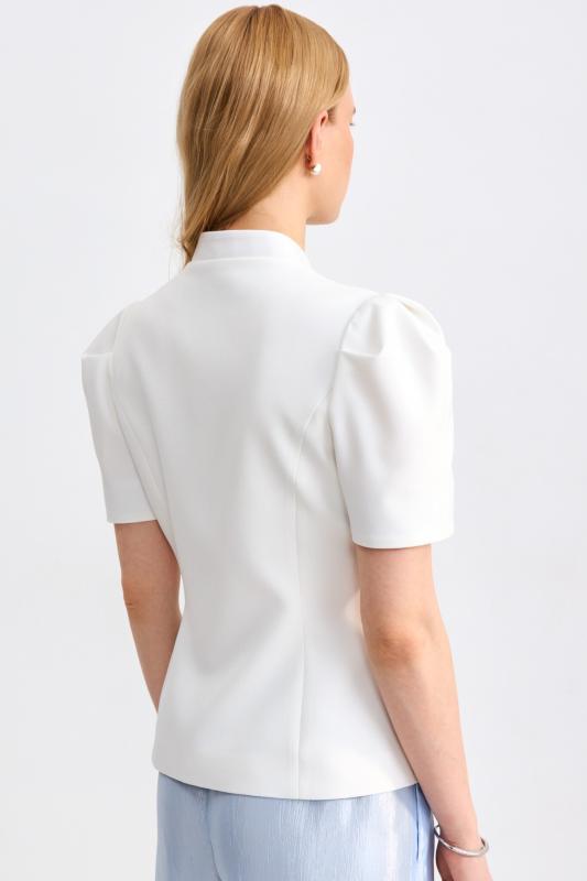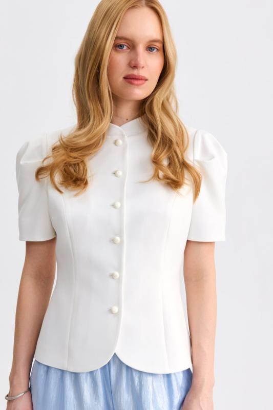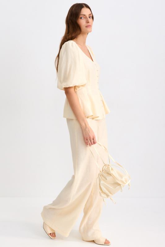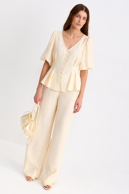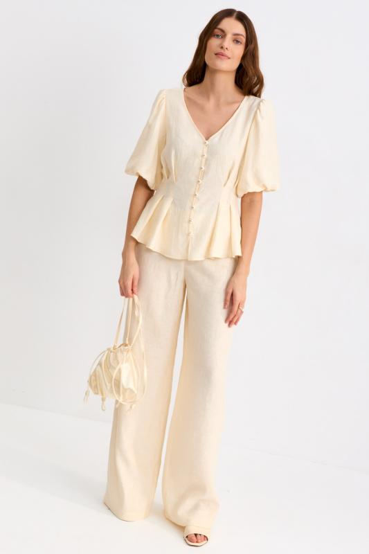 Блуза из фактурной вискозы молочного оттенка. Модель свободного силуэта. По переду V-вырез переходящий в воротник. Рукав спущенный, с широкой декоративной подгибкой.
